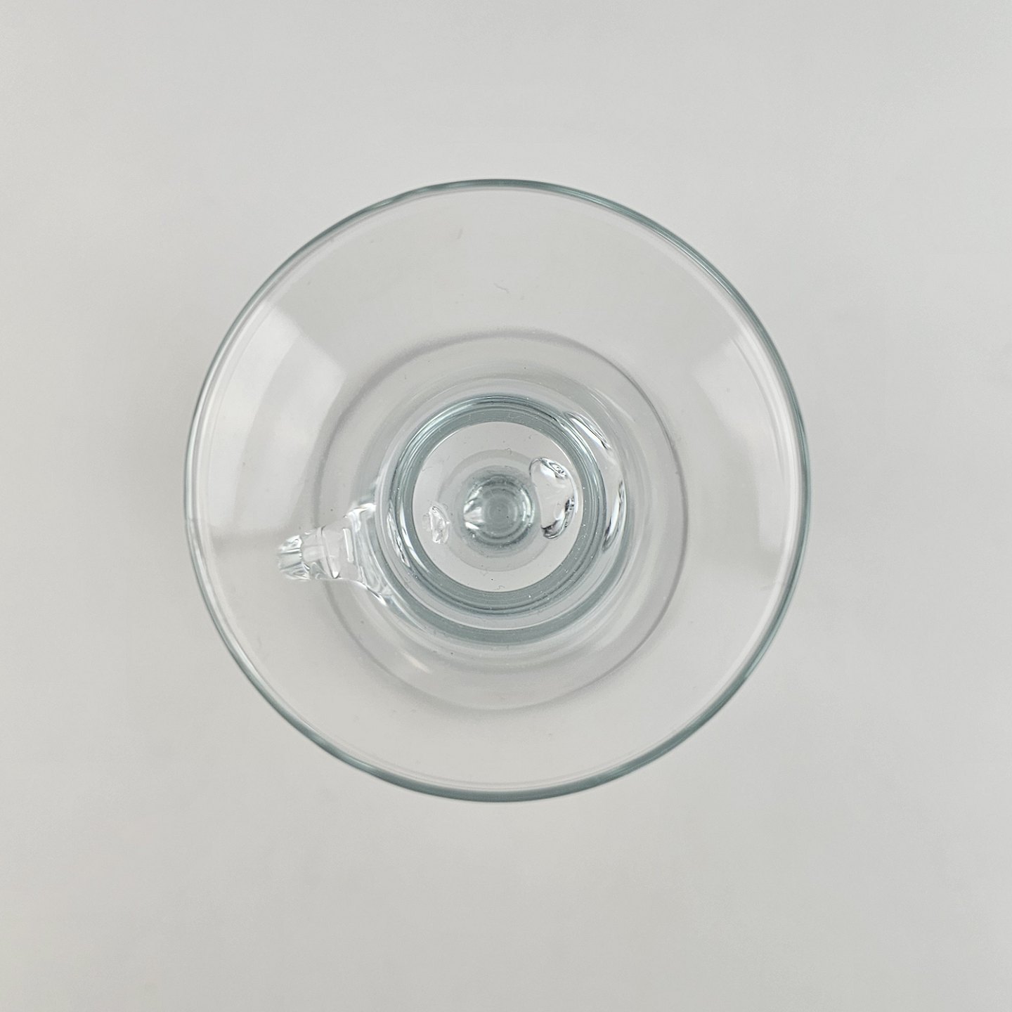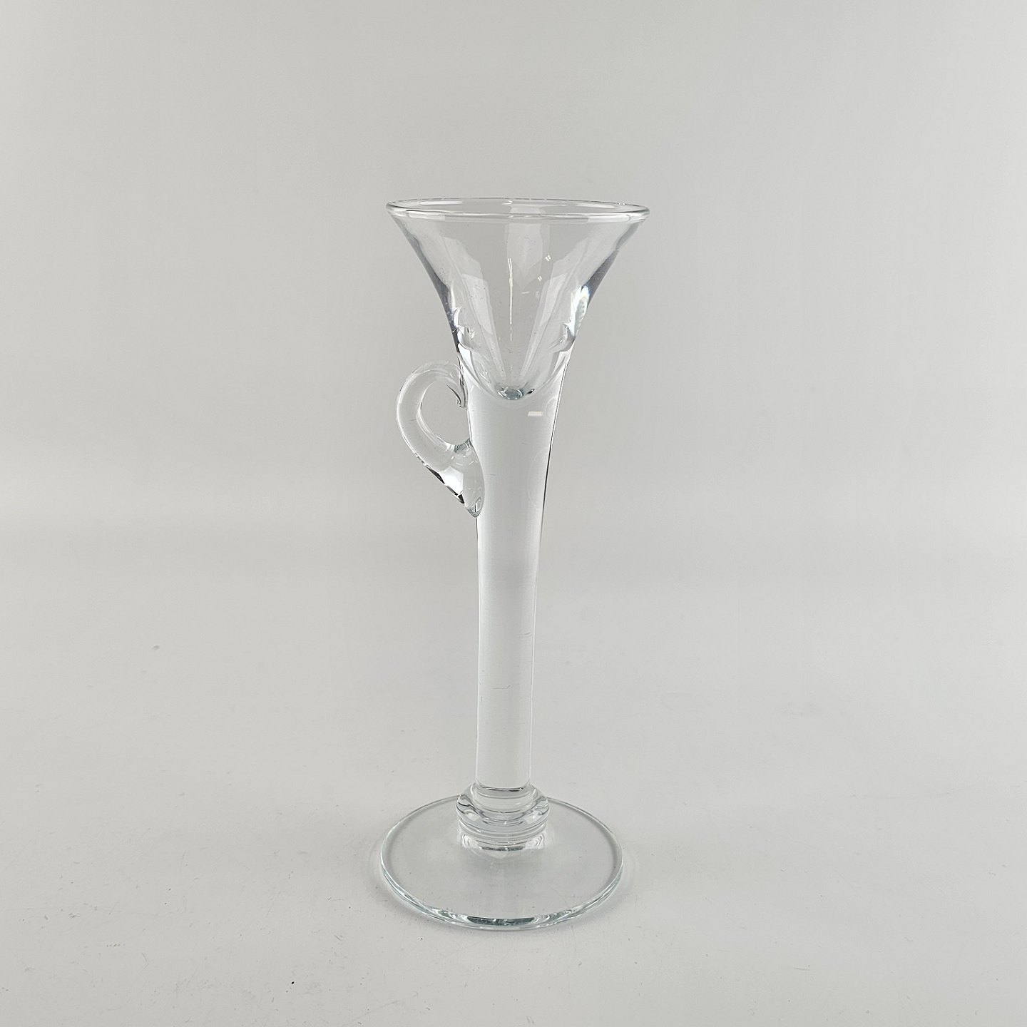 Højt snapseglas fra 1977 i klart glas fra serien Snapse doctor med titlen Hjertestyrkning.