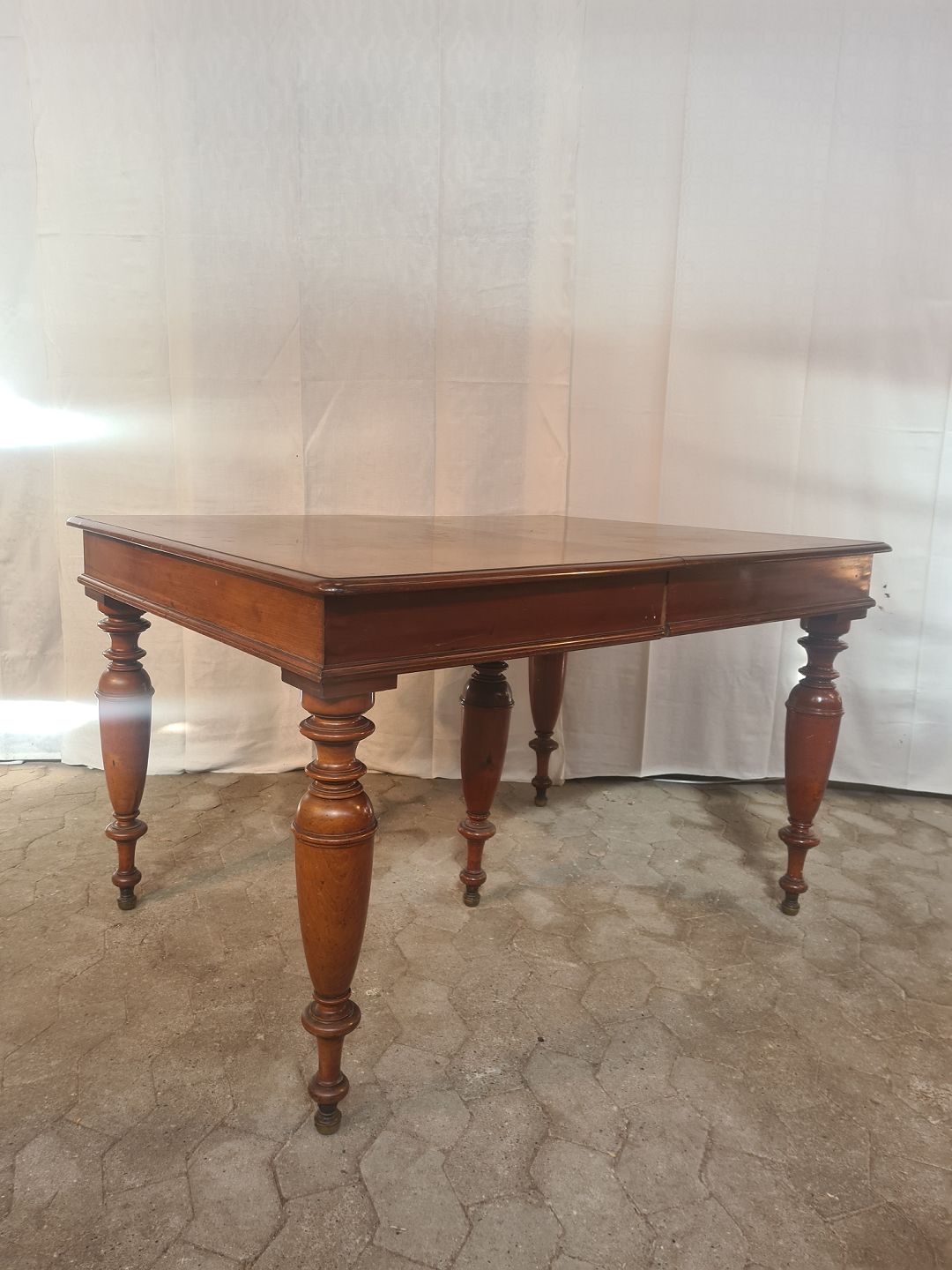 Spisebord i mahogni og bøgetræ med 2 tillægsplader, fra 1900erne.