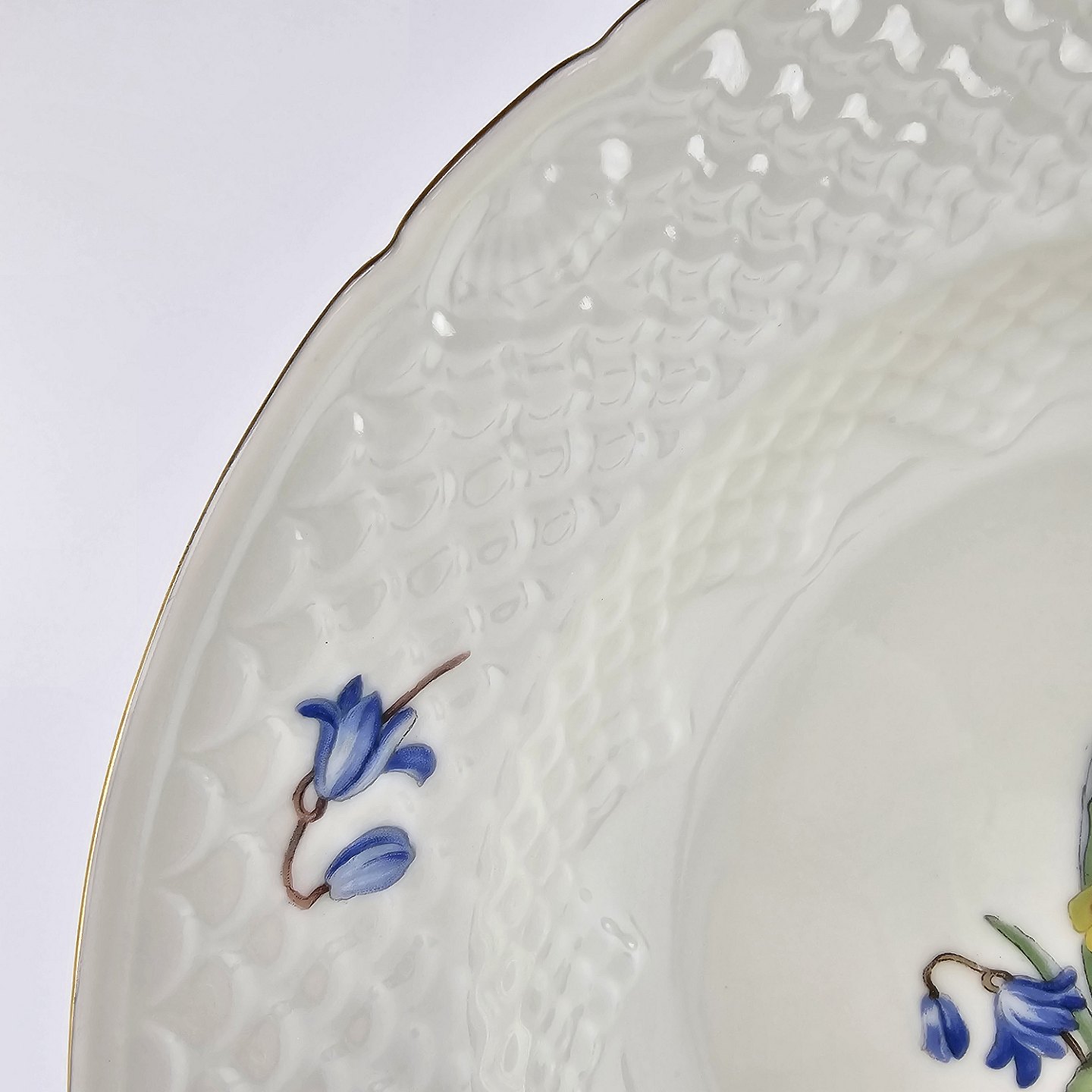 Njal er af creme farvet glaseret porcelæn, præget med skæl lignende mønster. Stellet er dekoreret med gul og blå blomster samt mønster af guld i kanten.