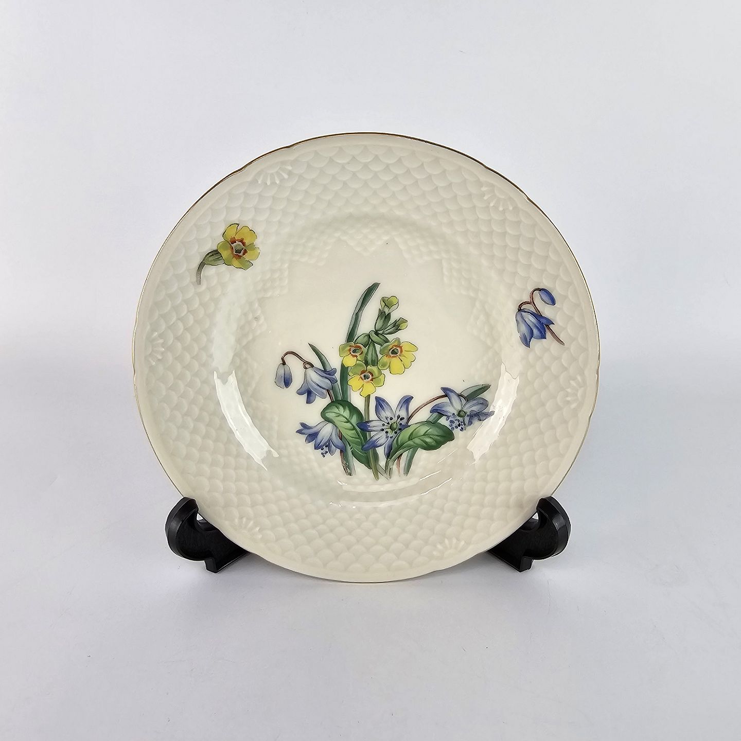 Njal er af creme farvet glaseret porcelæn, præget med skæl lignende mønster. Stellet er dekoreret med gul og blå blomster samt mønster af guld i kanten. Lettere brugsspor kan forekomme