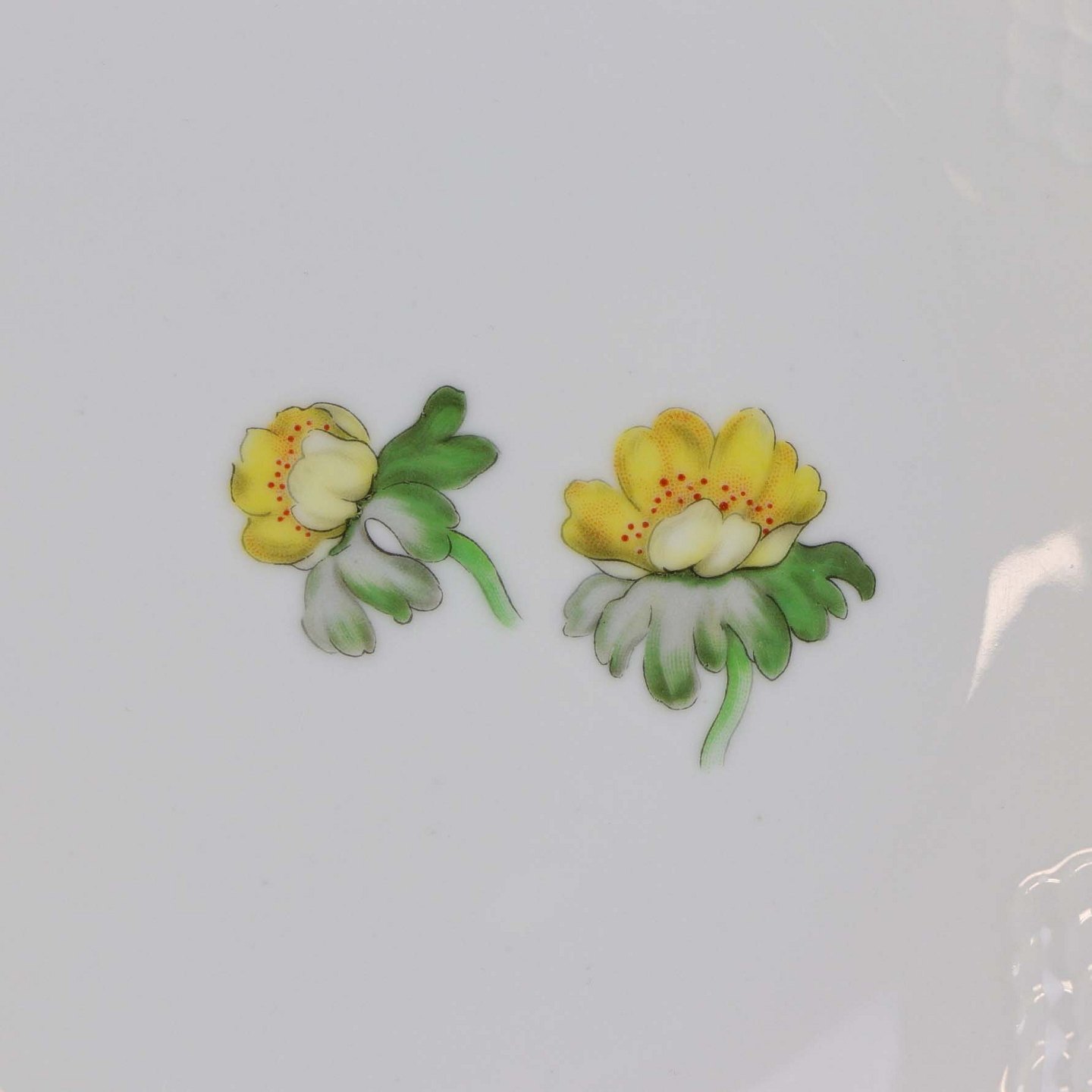 Hvidt porcelæn i skælform med dekoration af gule blomster og guldkant