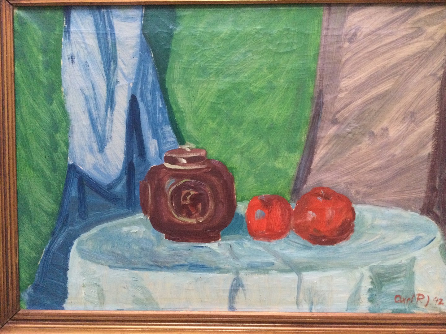 Opstilling på bord med Jais Nielsen lågbojan og æbler 1942