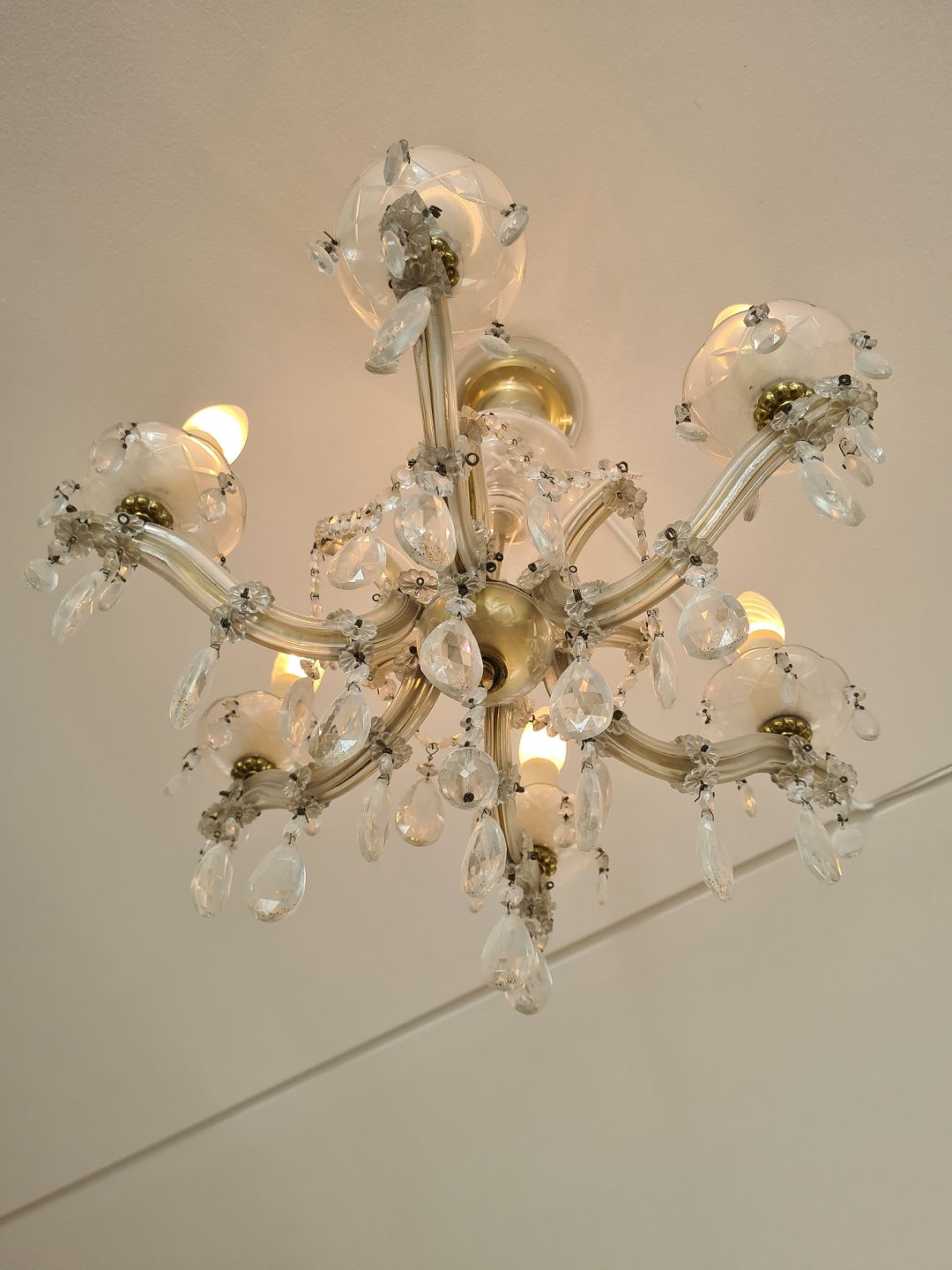 Ældre 6 armet prismelysekrone i glas og messing. Virker fint.