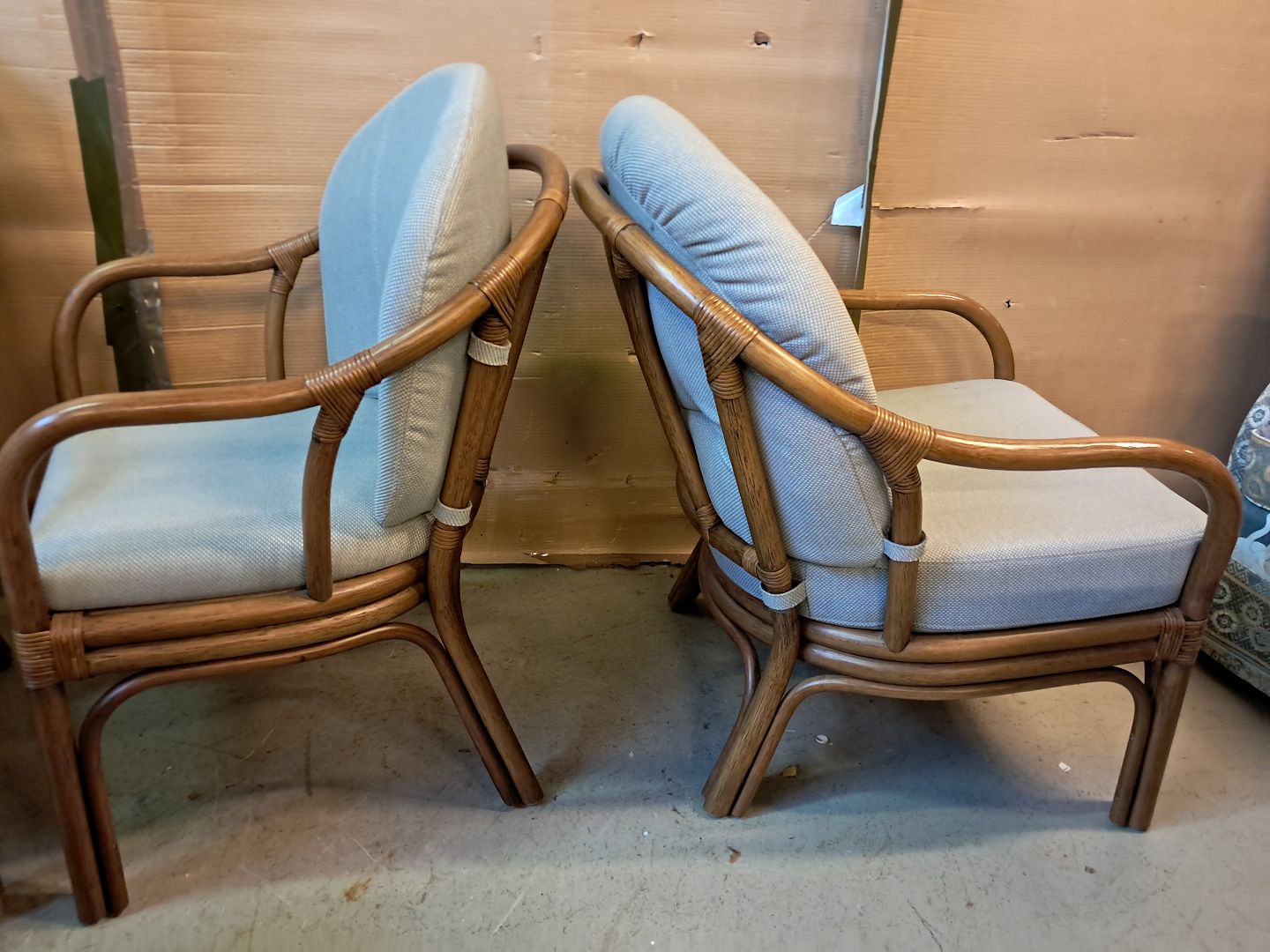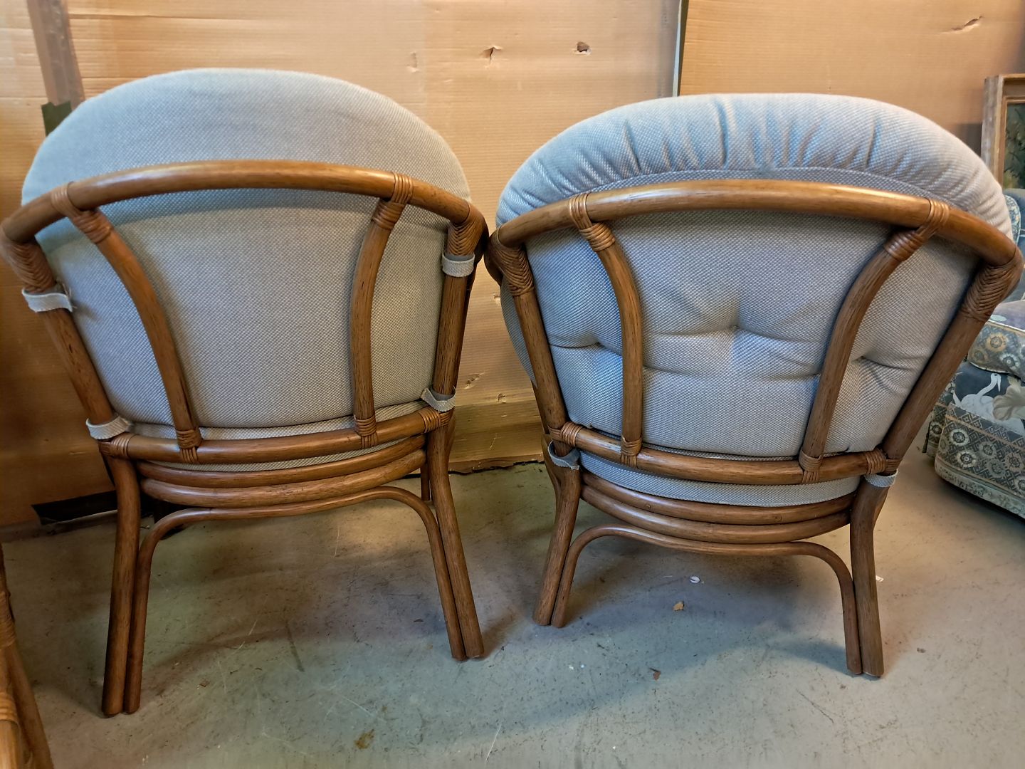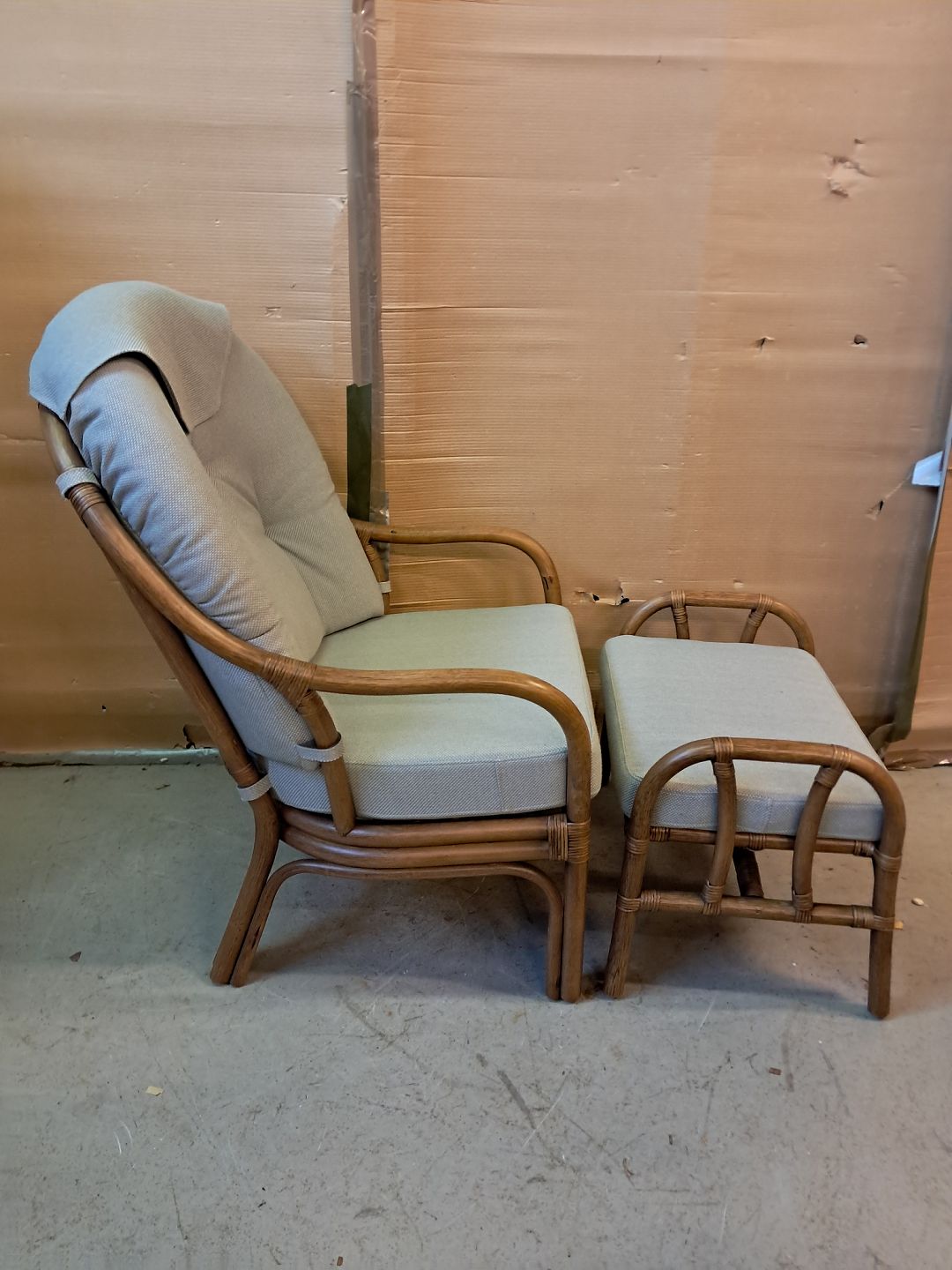 Text available in Danish: 3 Stole, en fodskammel og lille bord i bambus, af nyere dato.