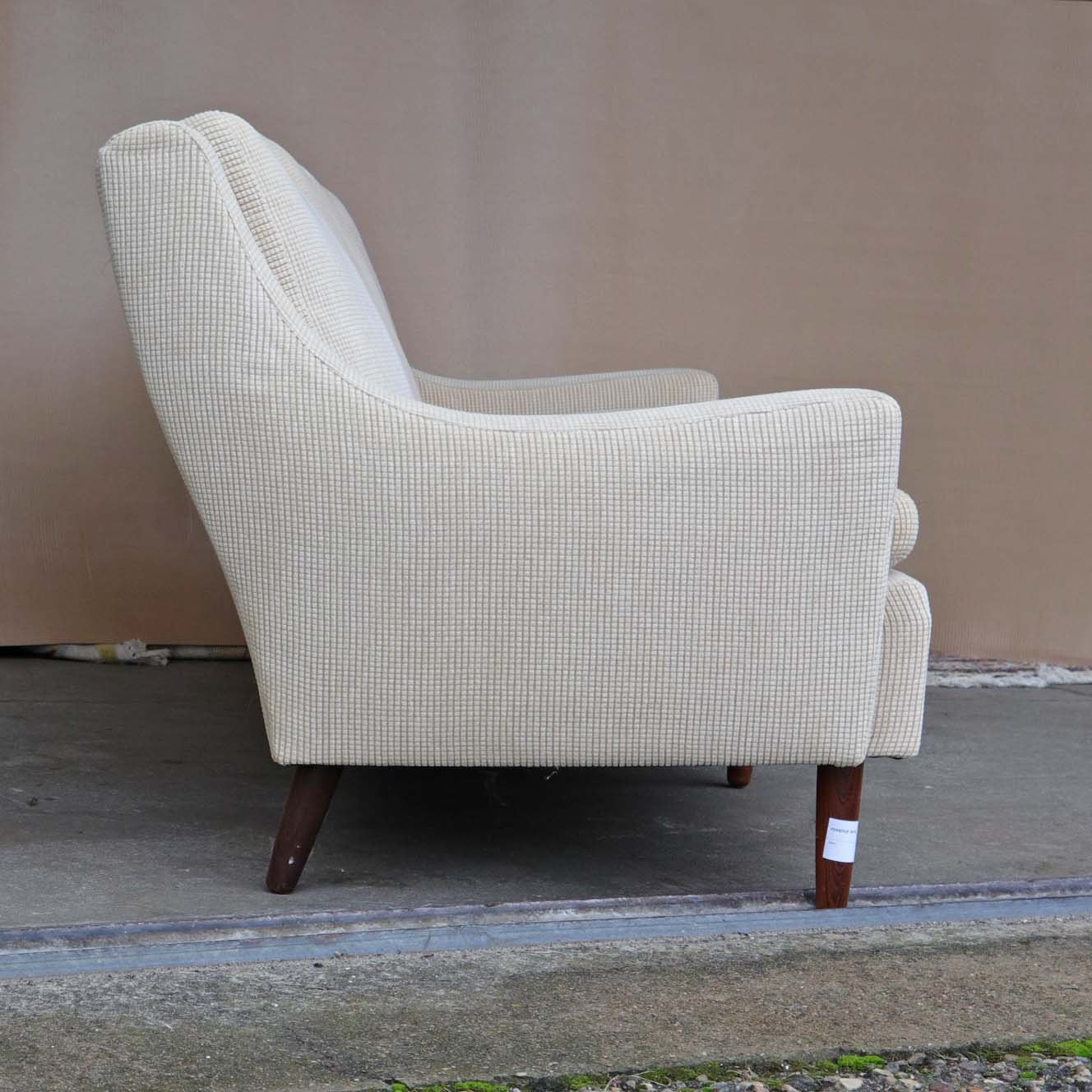 Tre personers sofa betrukket med lyst fløjlsstof i flot stand og ben af lakeret mørkt træ