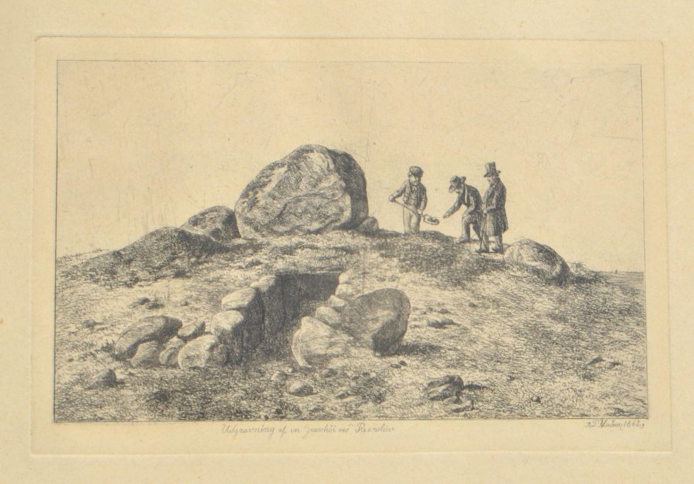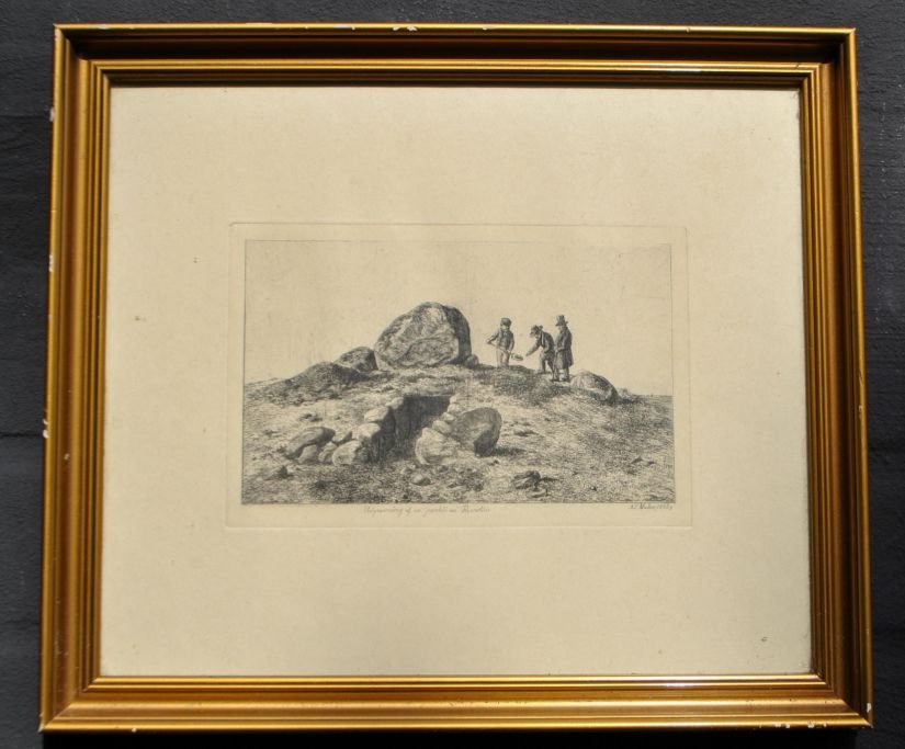 Madsen, Andreas Peter (1822 - 1911) Danmark: Udgravning af en Gravhøi ved Reersløv.  Radering. Signeret 1862. 12 x 18 cm.