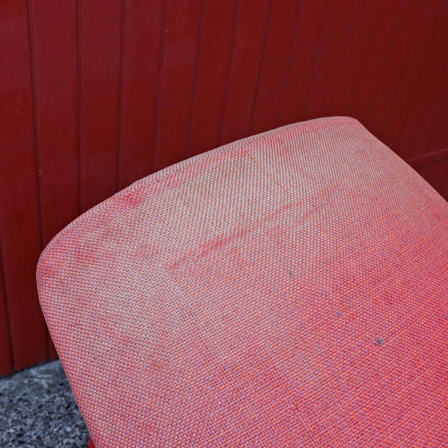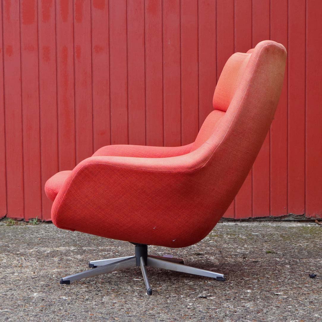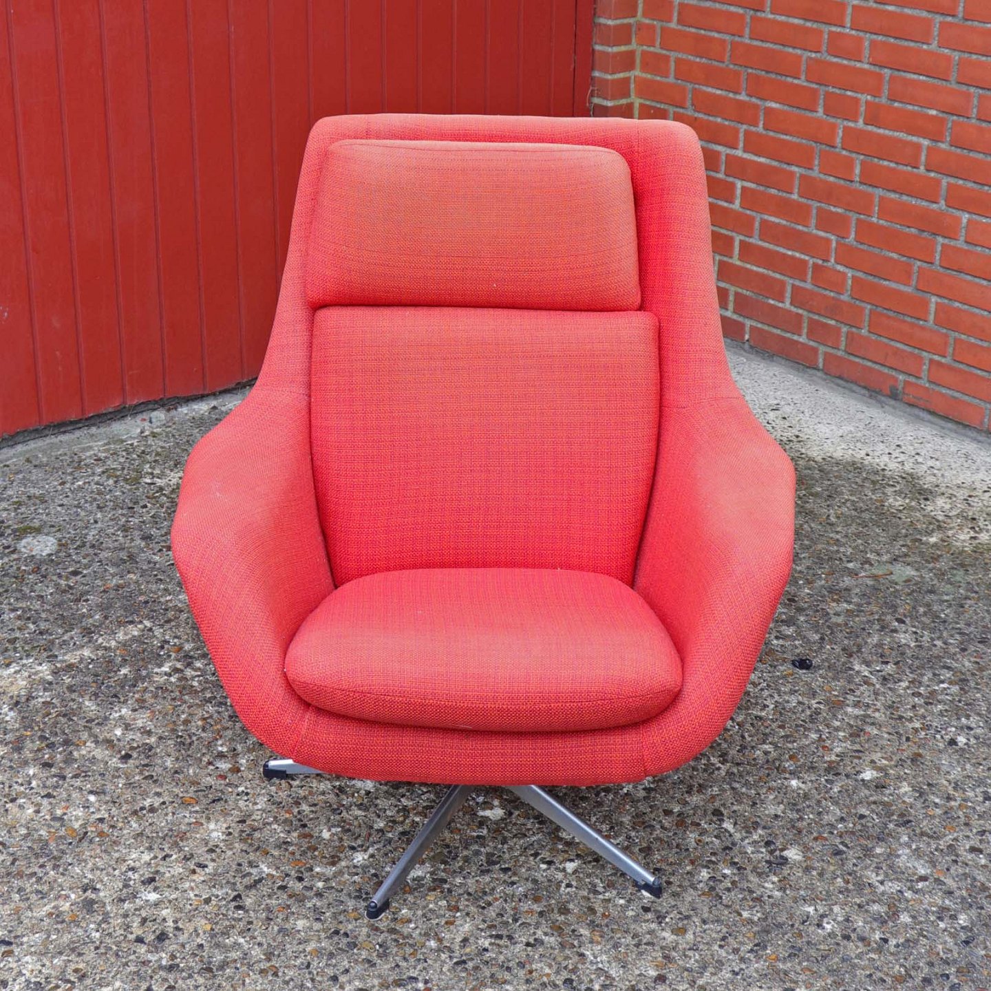 Lænestol med dreje 5pas fod af metal. Stolen er betrukket med orangerød uldstof