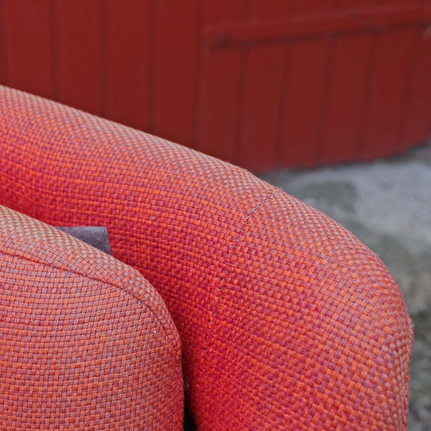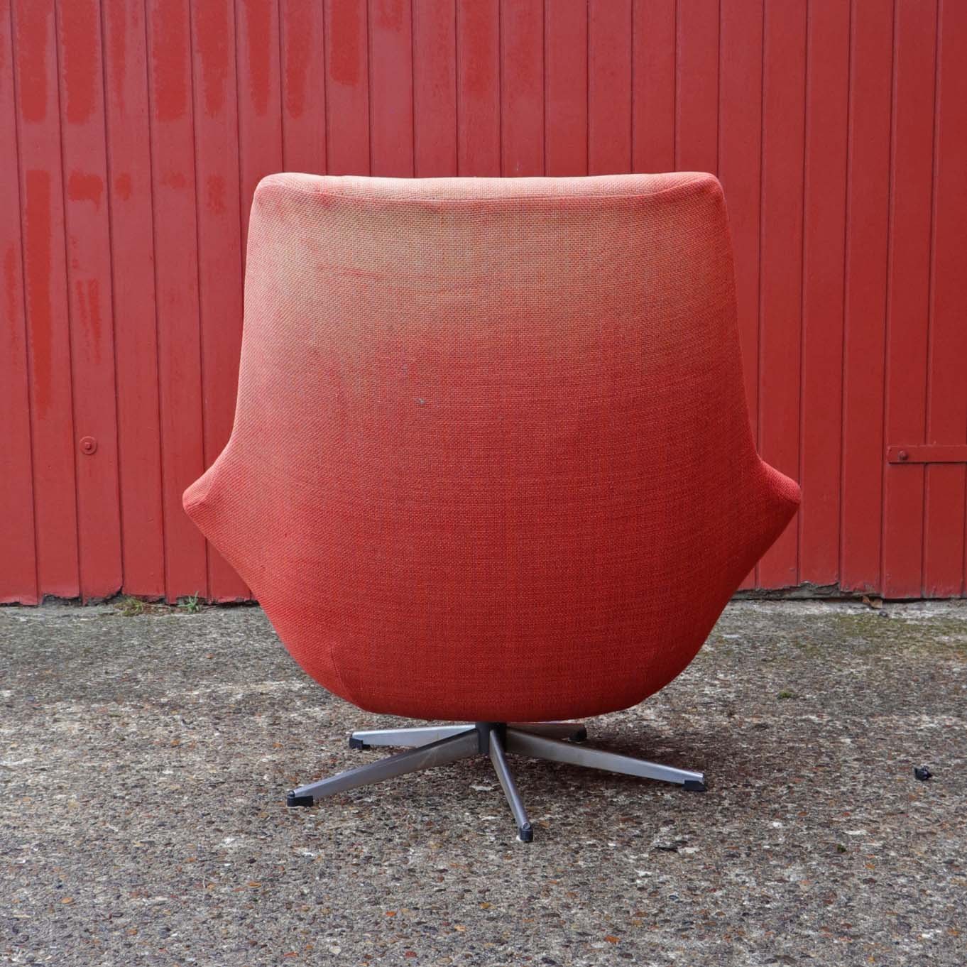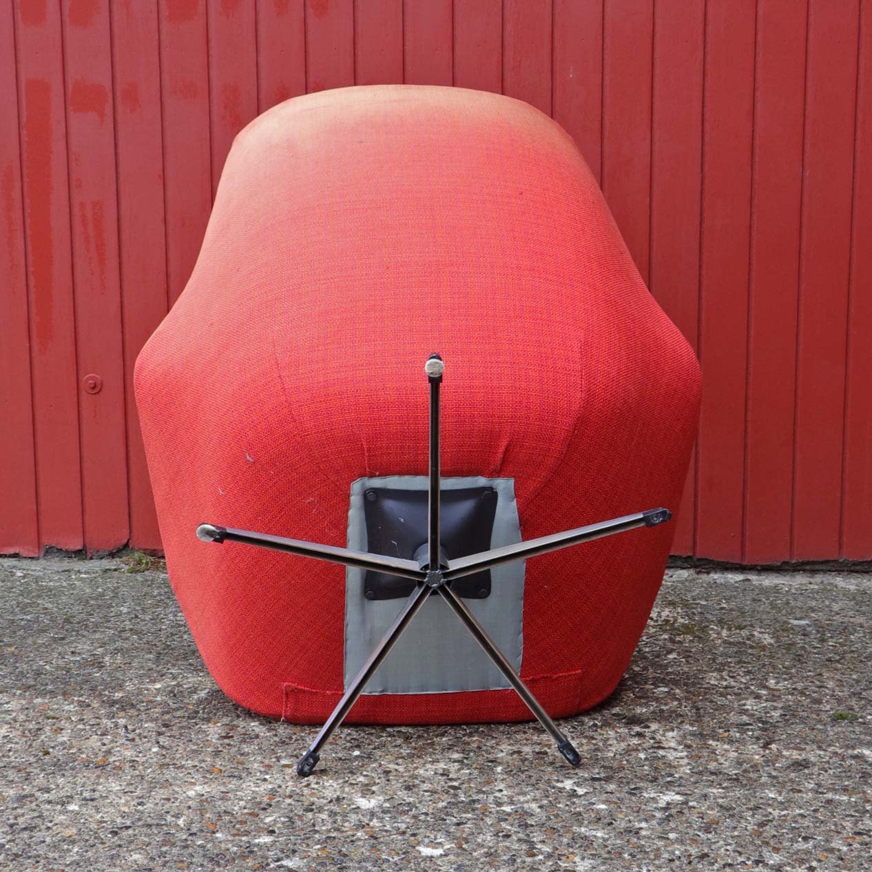 Lænestol med dreje 5pas fod af metal. Stolen er betrukket med orangerød uldstof