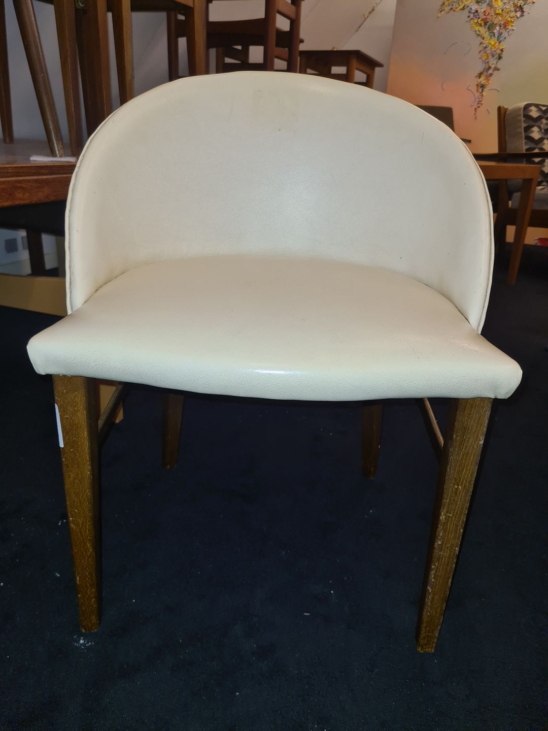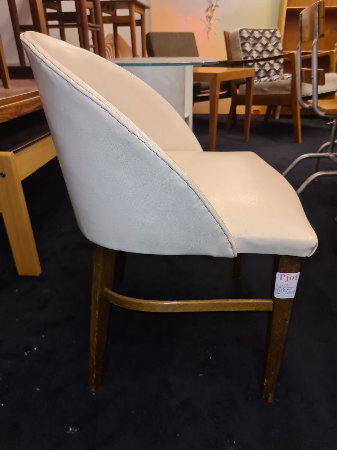 Frode Holms sminkestol fra 1950'erne. Overpolstret med nappa, stel i bøg. Fremstår pæn, velholdt og udmærket stabil.