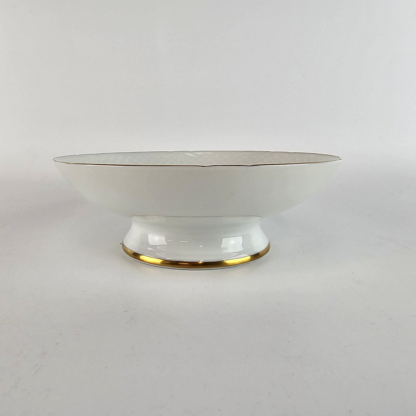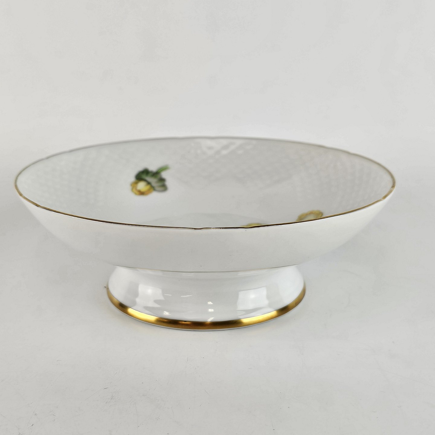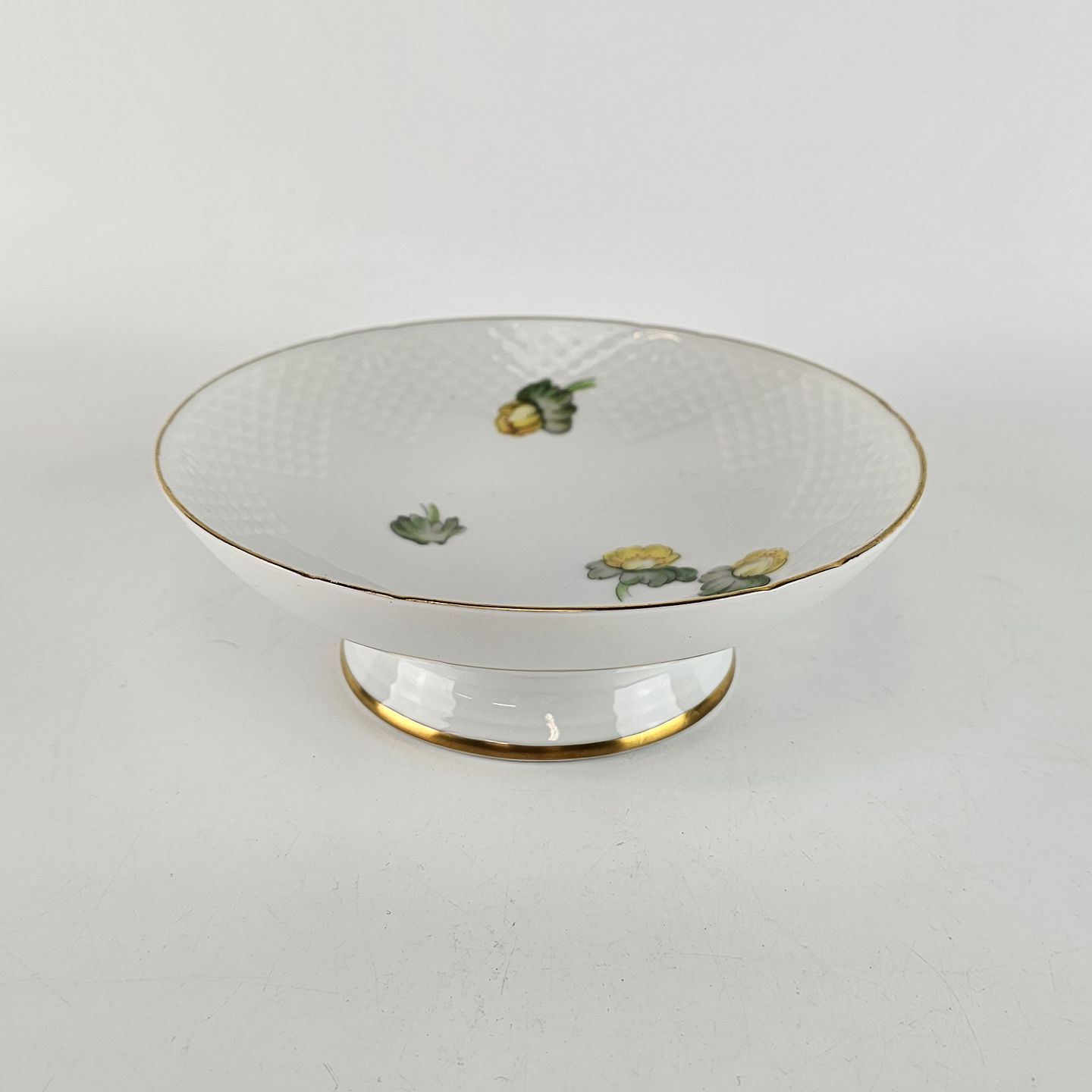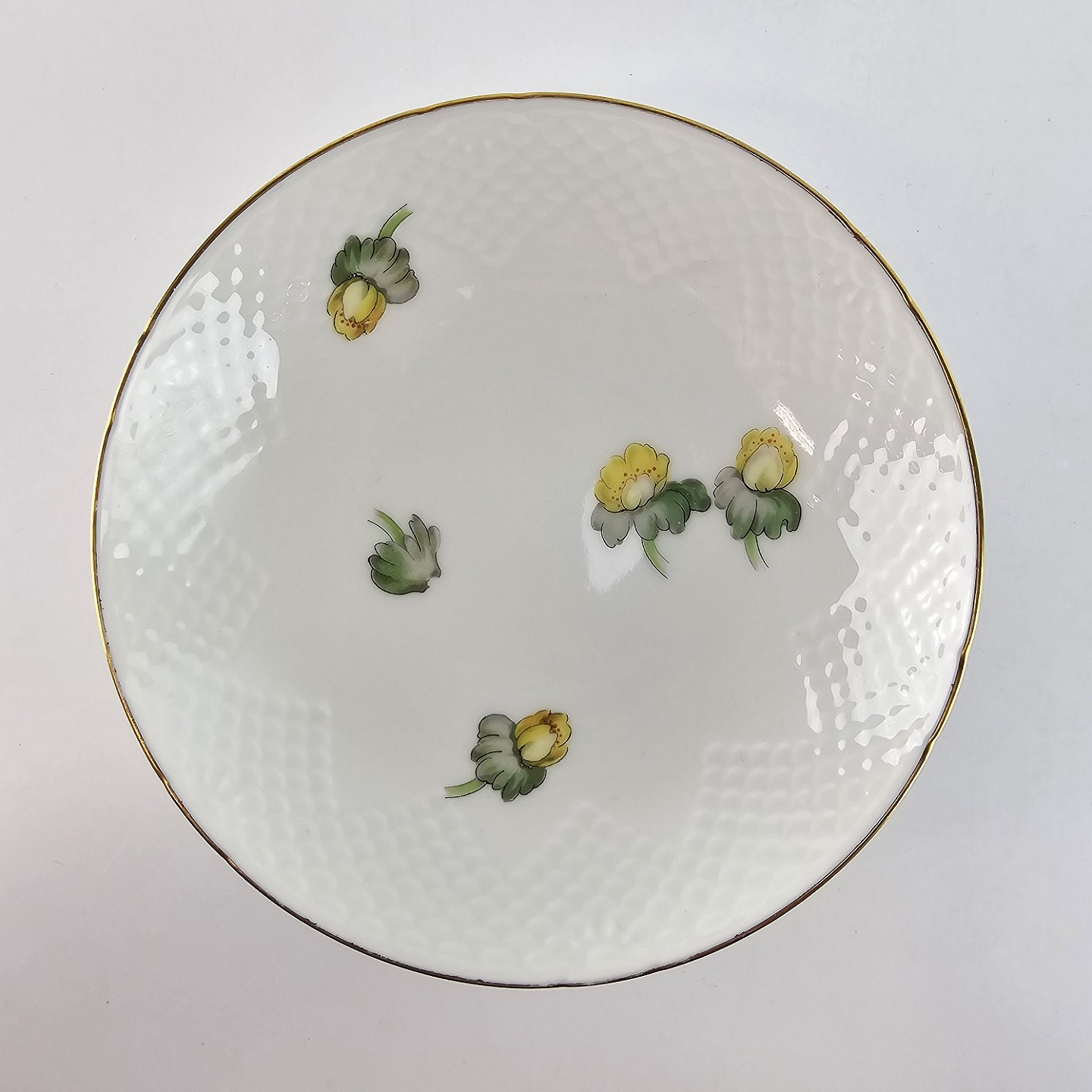 Hvidt porcelæn i skælform med dekoration af gule blomster og guldkant