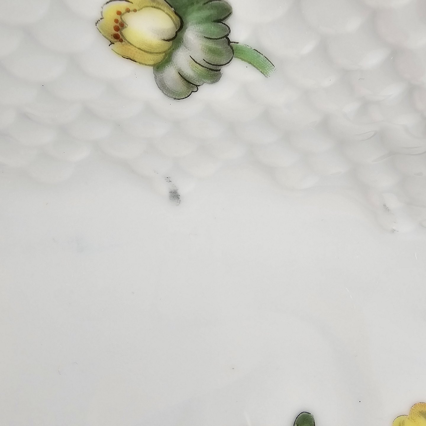 Hvidt porcelæn i skælform med dekoration af gule blomster og guldkant