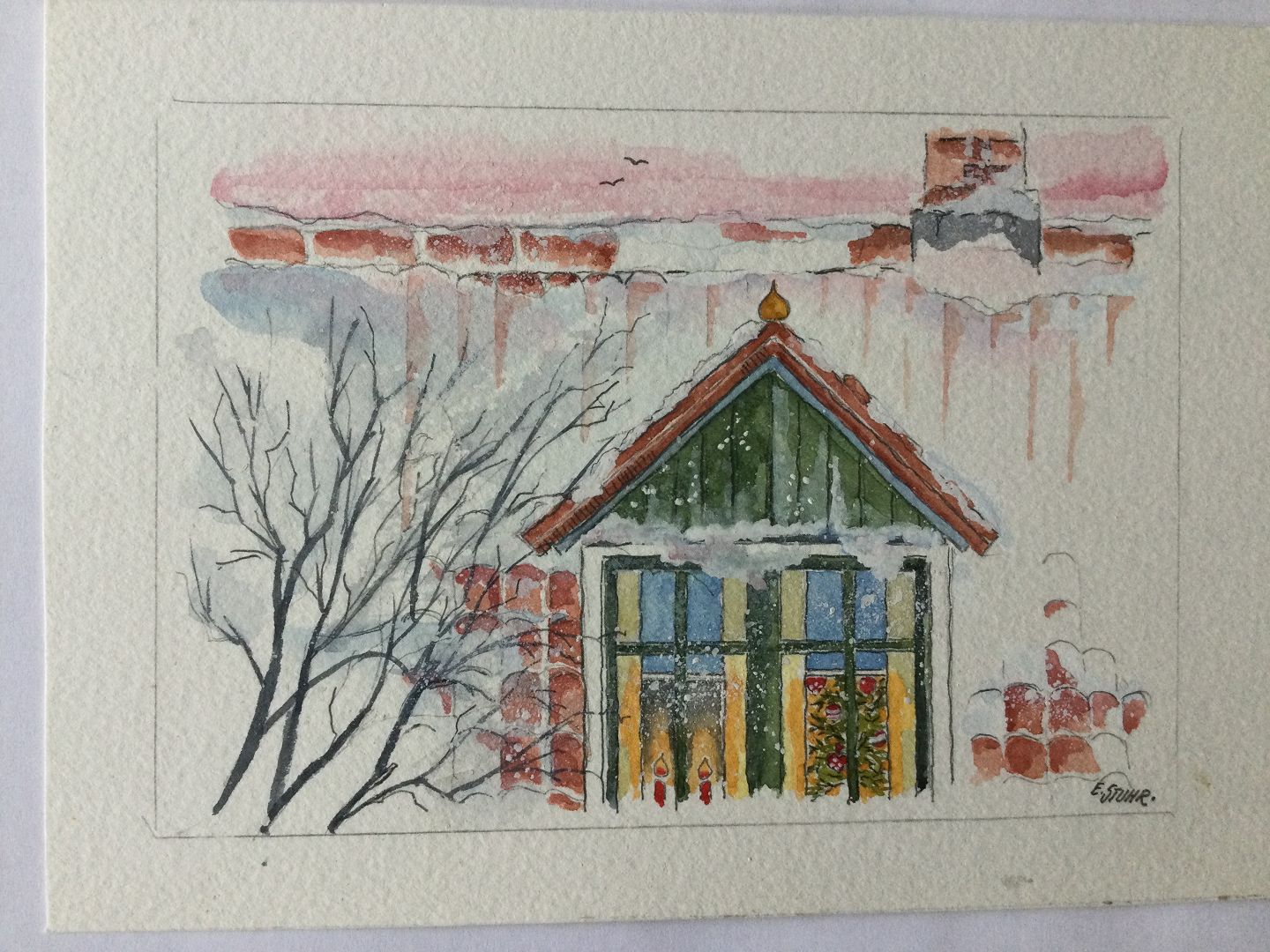Akvarel af Erik Stuhr - Sneklædt kvist med julestemning.