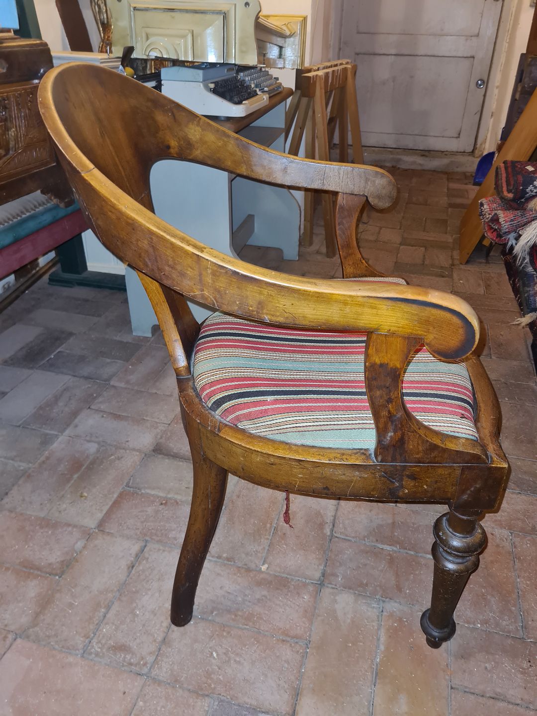 Armstol udført i mahogni samt sæde betrukket med uldstof.