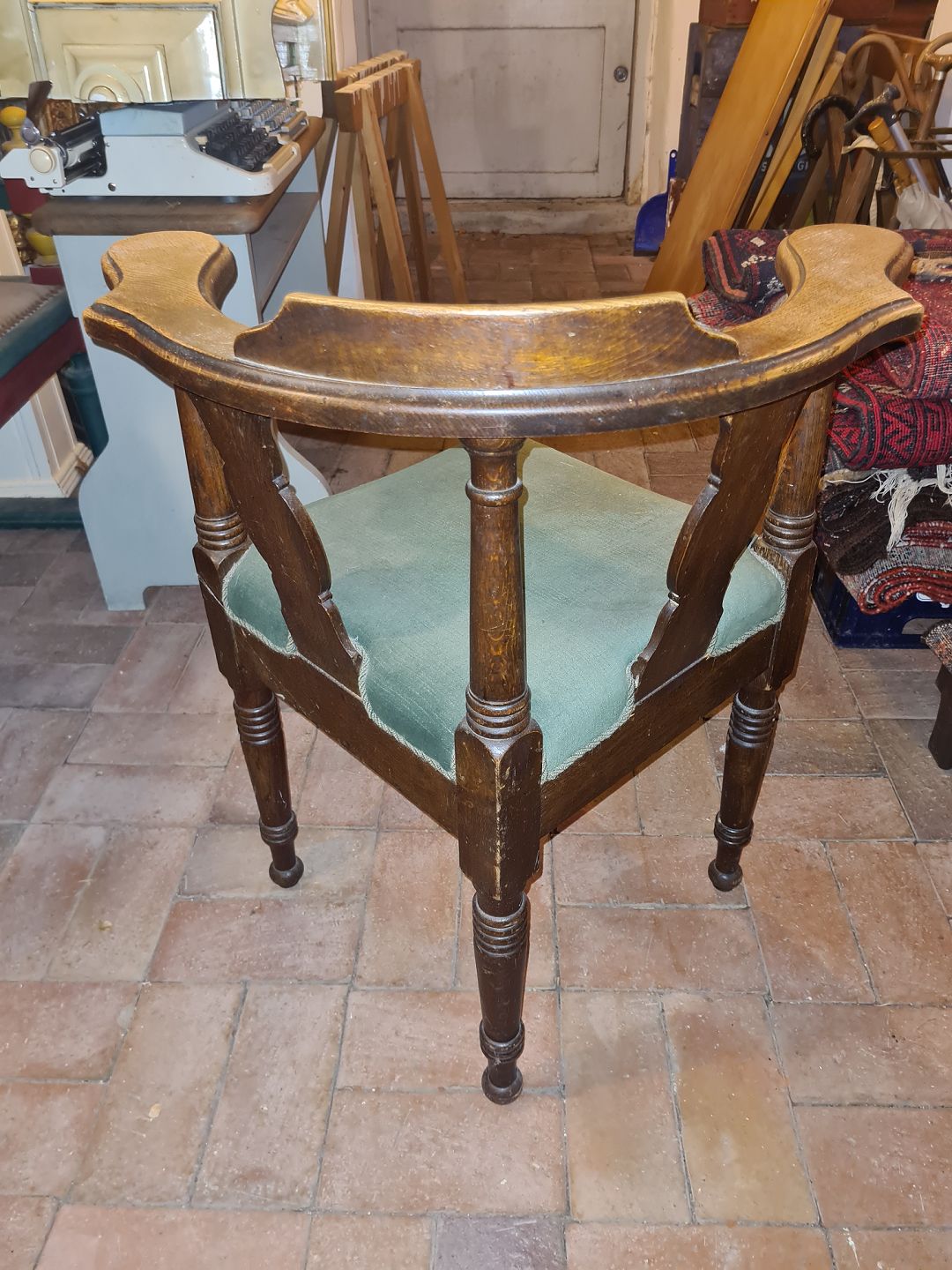 Hjørnestol i mørkbejdset egetræ med sæde betrukket i velor stof.