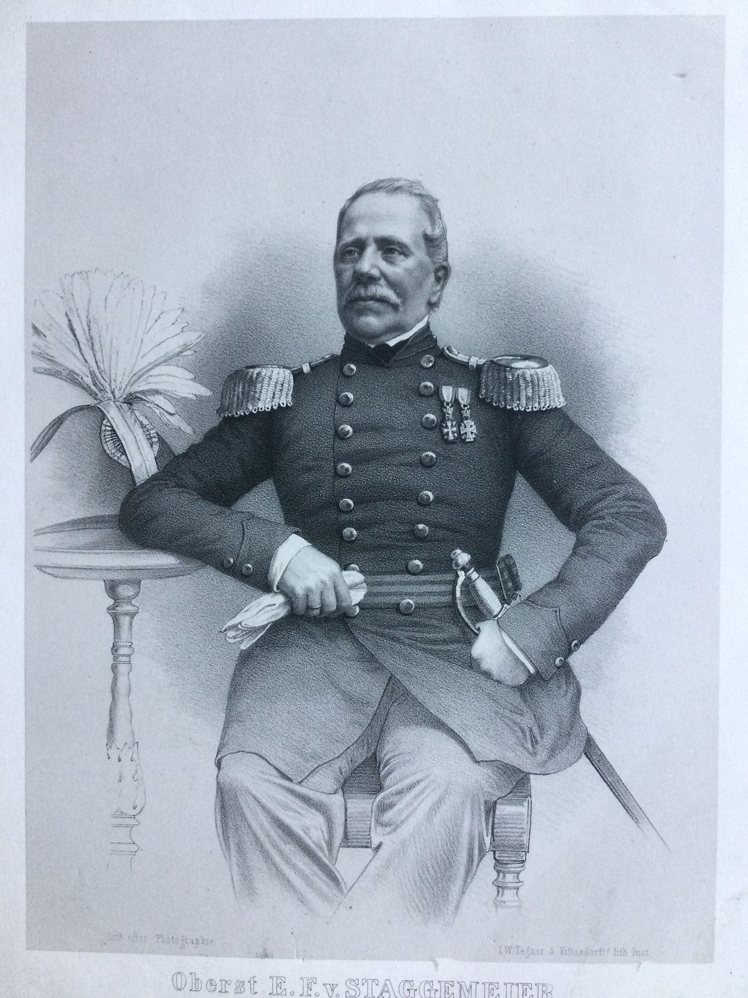 Betegnet - "Oberst E.F. v. Staggemeier - Ridder af Dannebroge og Dannebrogsmand - commandeur for den 11te Linie Bataillon"