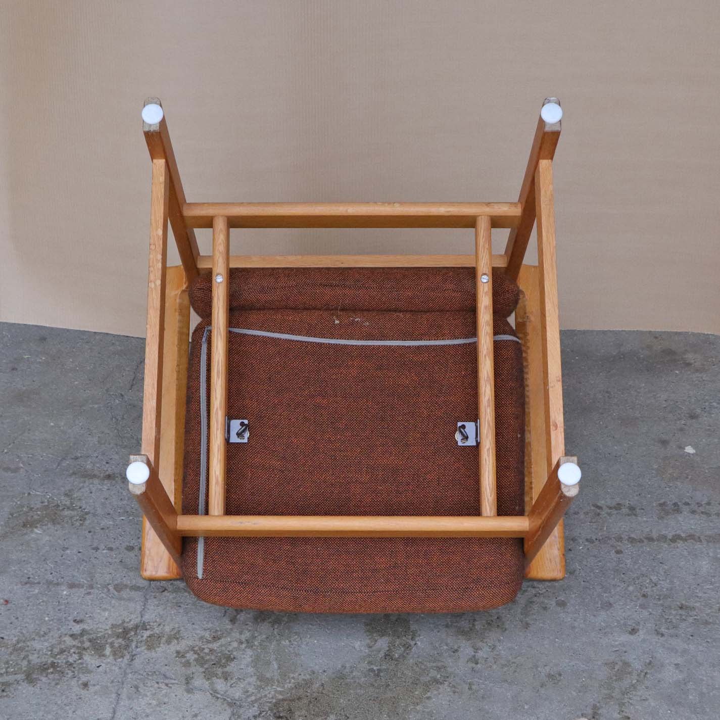 Text available in Danish: Højrygget armstol med polstret ryg og sæde samt nakkepude. Stolen er betrukket med brun meleret uldstof og stellet er i lakeret egetræ