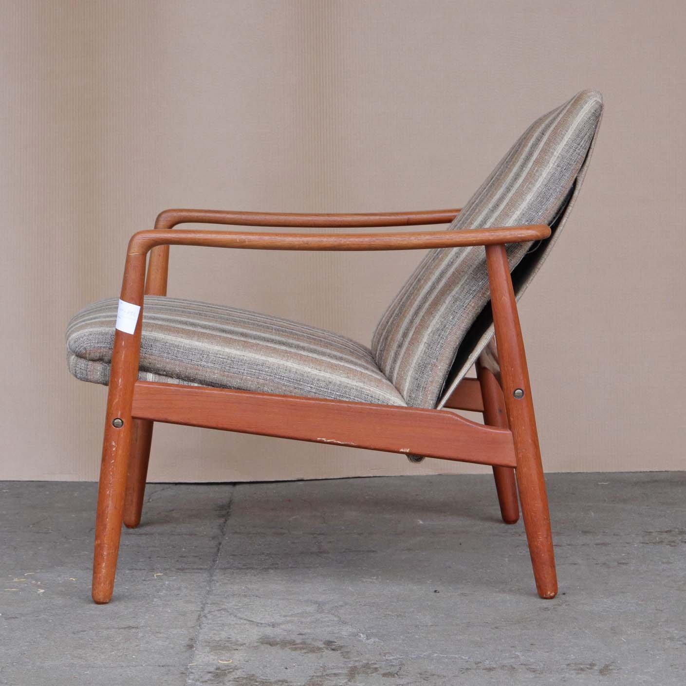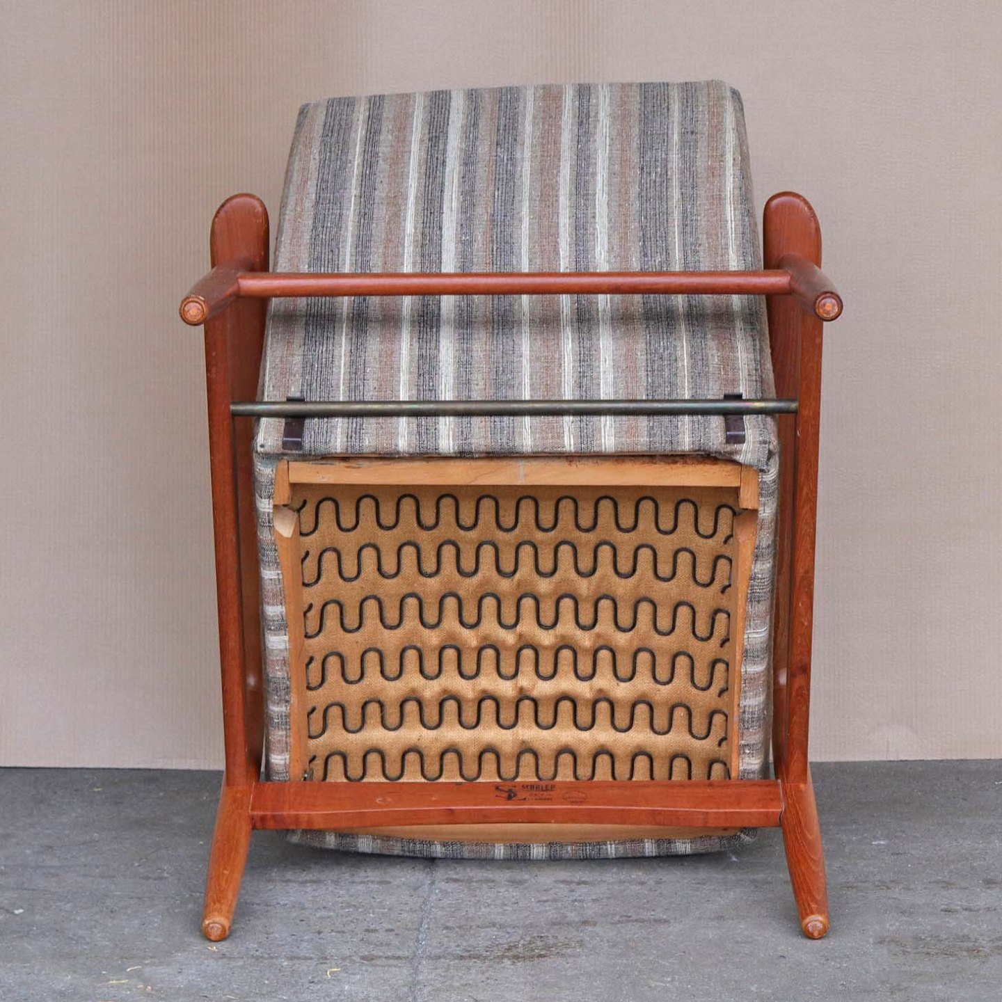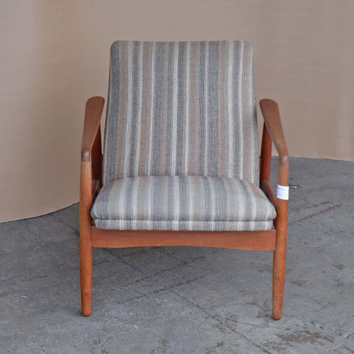 Lænestol fra 1960'erne med stel i teaktræ og letpolstret sæde og ryg betrukket med stribet uldstof