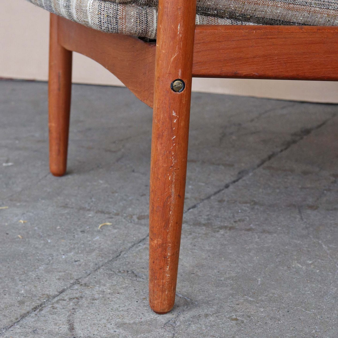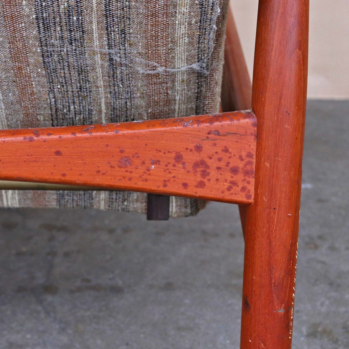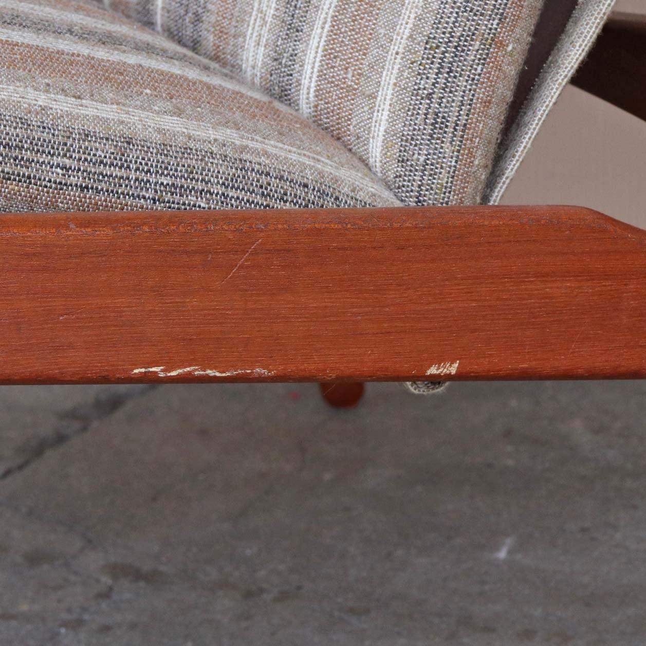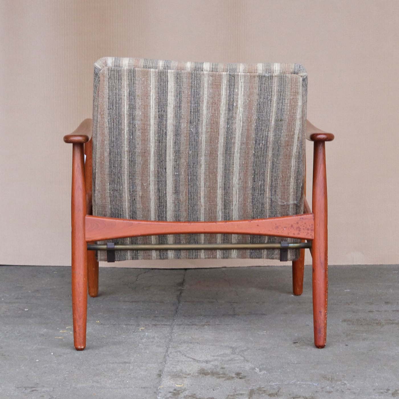 Lænestol fra 1960'erne med stel i teaktræ og letpolstret sæde og ryg betrukket med stribet uldstof