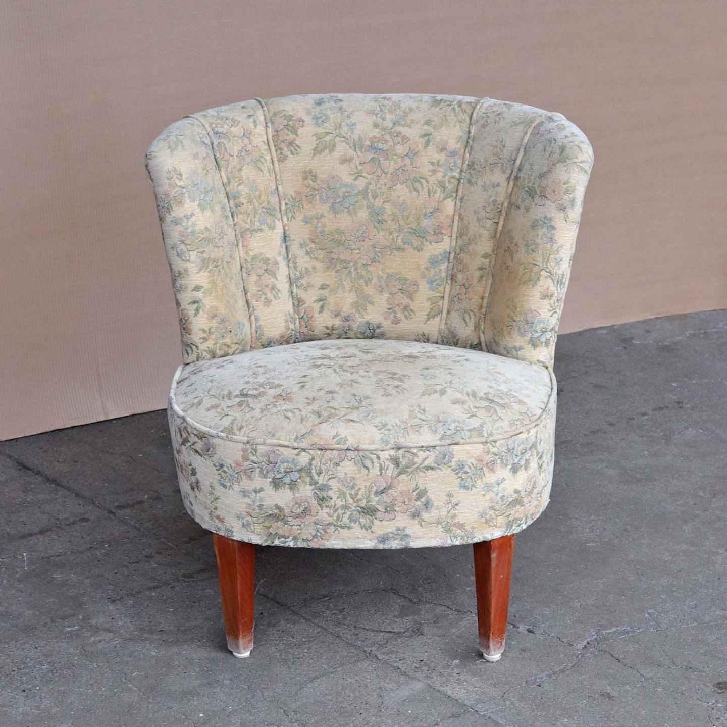 Text available in Danish: Ældre lænestol med rund ryg og stel i lakeret teaktræ. Stolen er betrukket med lyst stof med blomstermønster og har sæde med springfjeder