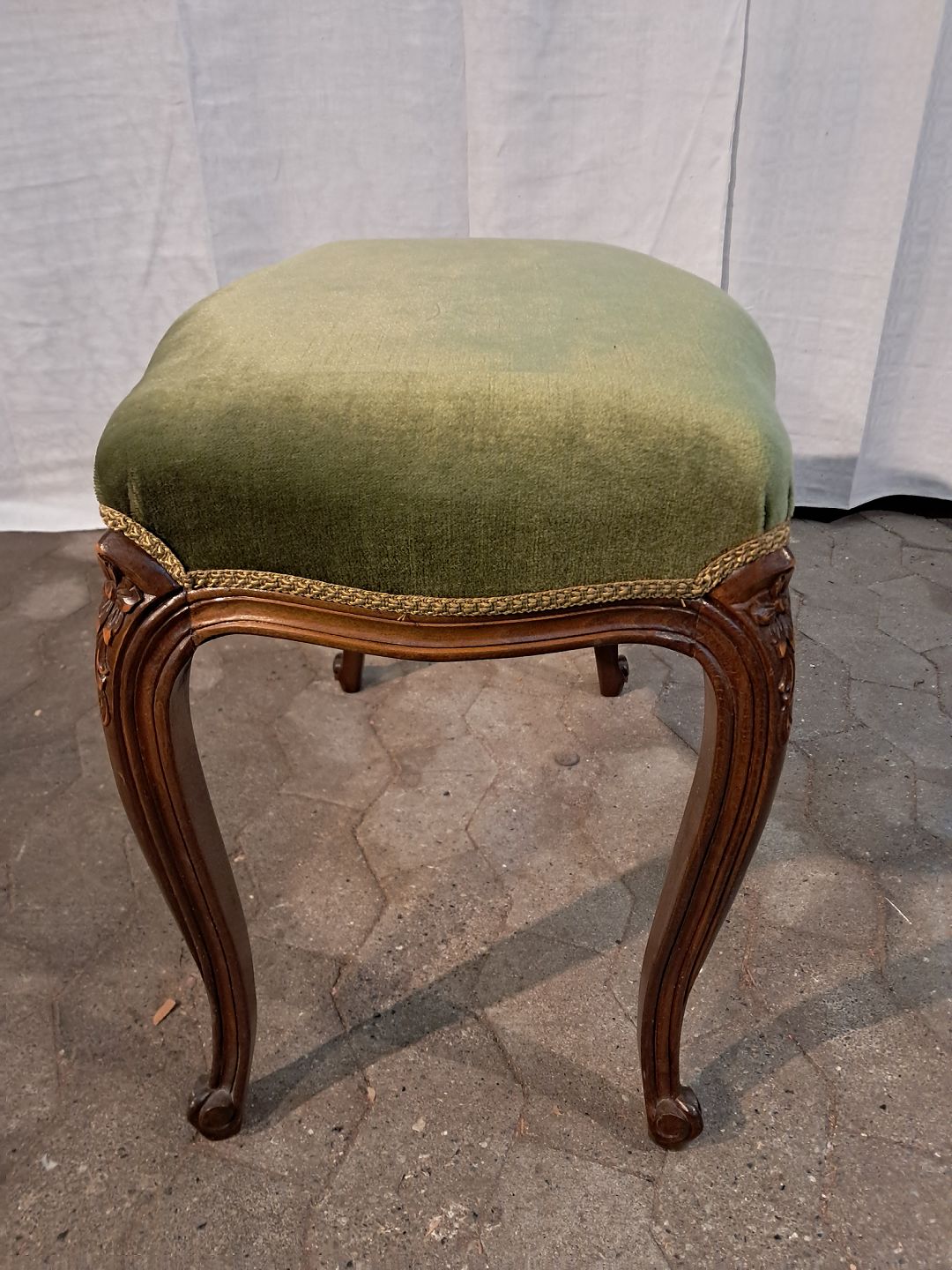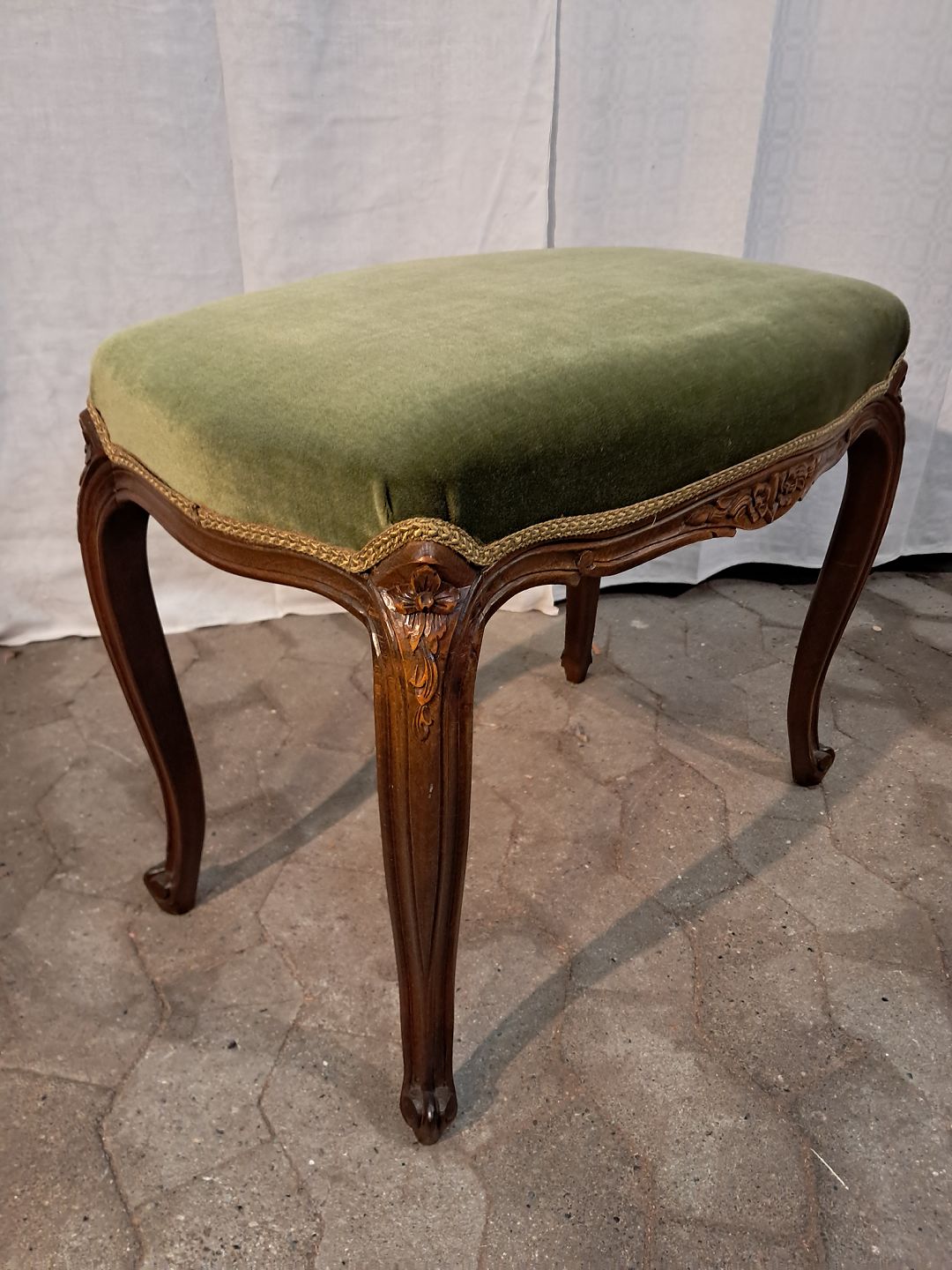 Skammel i massivt bøgetræ med velour betræk, fra 1980erne.