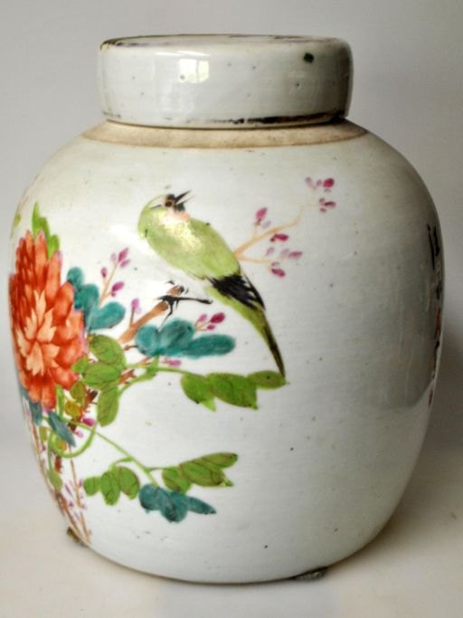 Chinese lid bojan, 19th century. Polychrome decoration with flowers and birds. With black text. Stamped. H.: 24 cm.