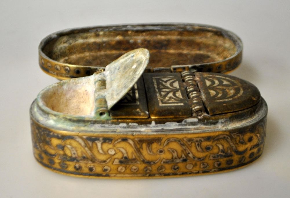 Asian container for betel and burnt lime, 19th century. Brass with inlaid silver in patterns. Oval. L. 11.5 cm. W.: 5.7 cm. Height: 4 cm.