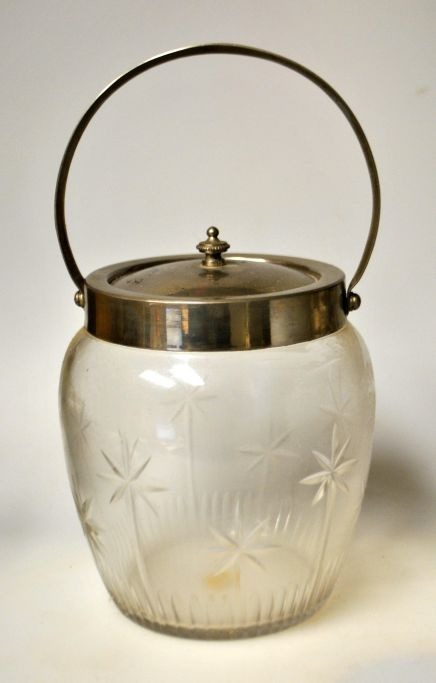 Fyens Glasværk kiksespand i klart glas med slibninger, ca. 1910, Danmark. Med låg og hank i metal. H: 15 cm. Højde til hank: 24 cm.
