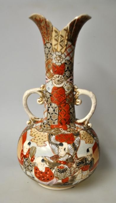 Japansk satsuma vase med to hanke, 19. årh. Håndbemalede dekorationer med børn og kvinder. Med forgyldning. H.: 30,5 cm.