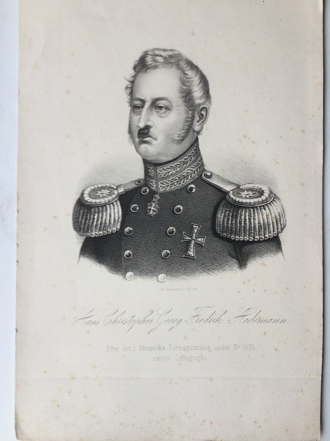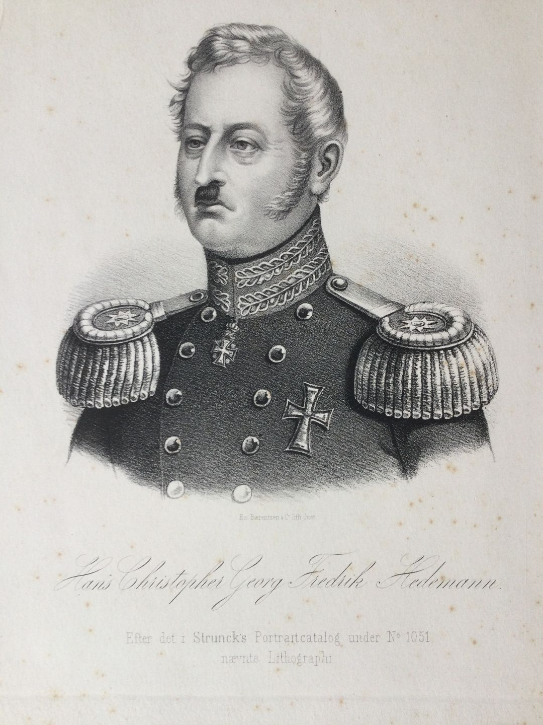 Litografi af Em. Bærentzen - Portræt af General Hans Hedemann.