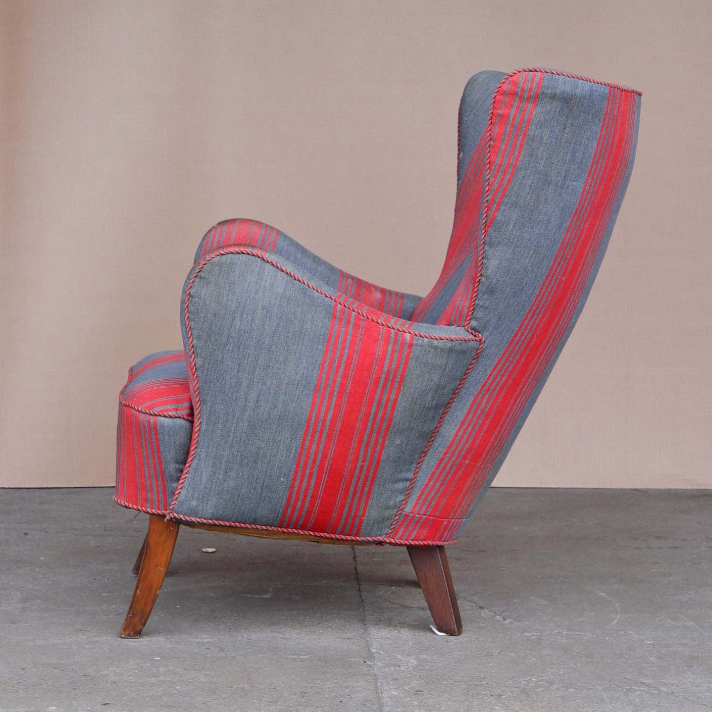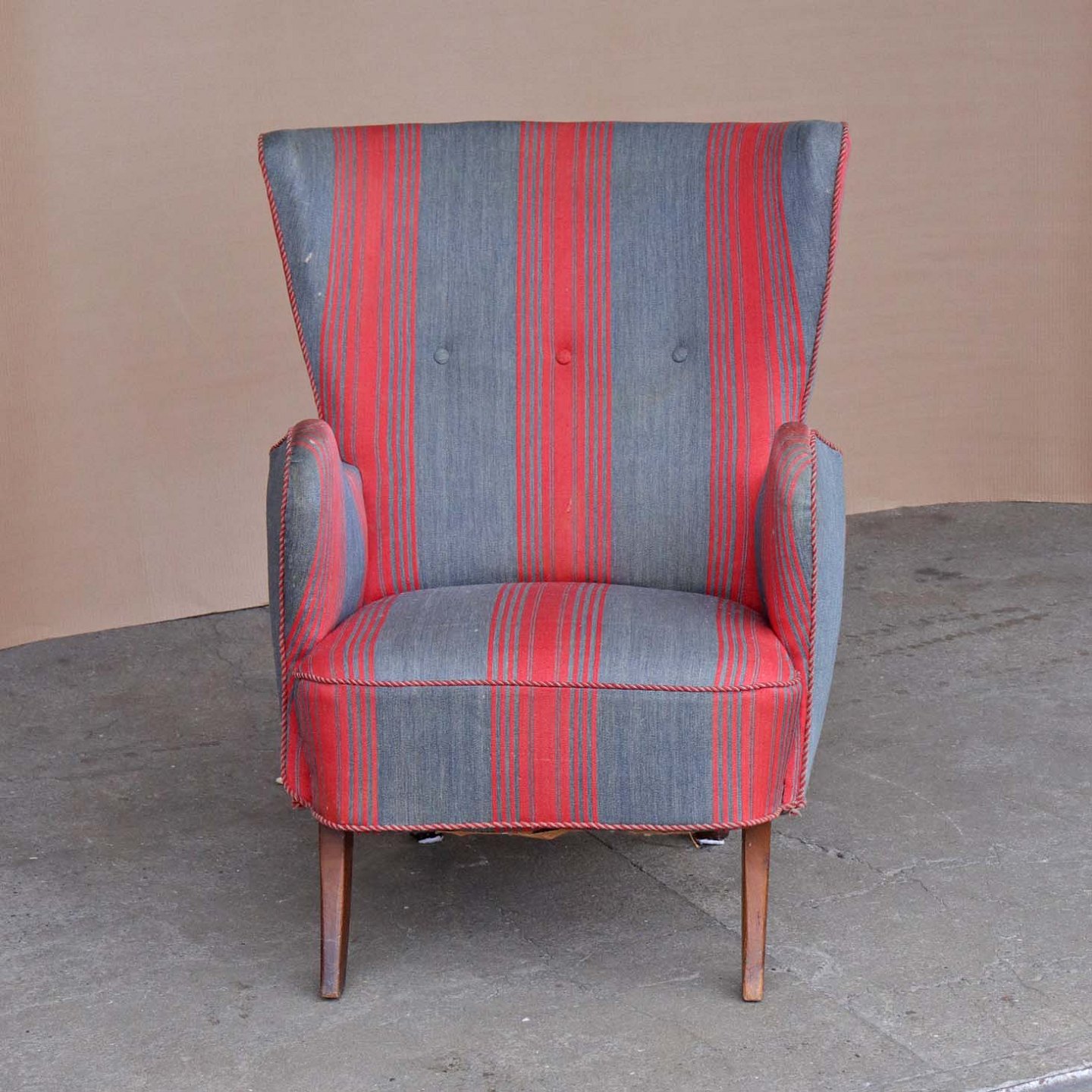 Text available in Danish: Ældre lænestol med springfjeder sæde og ben af mørk lakeret træ. Stolen er betrukket med gråt og rød stibet stof