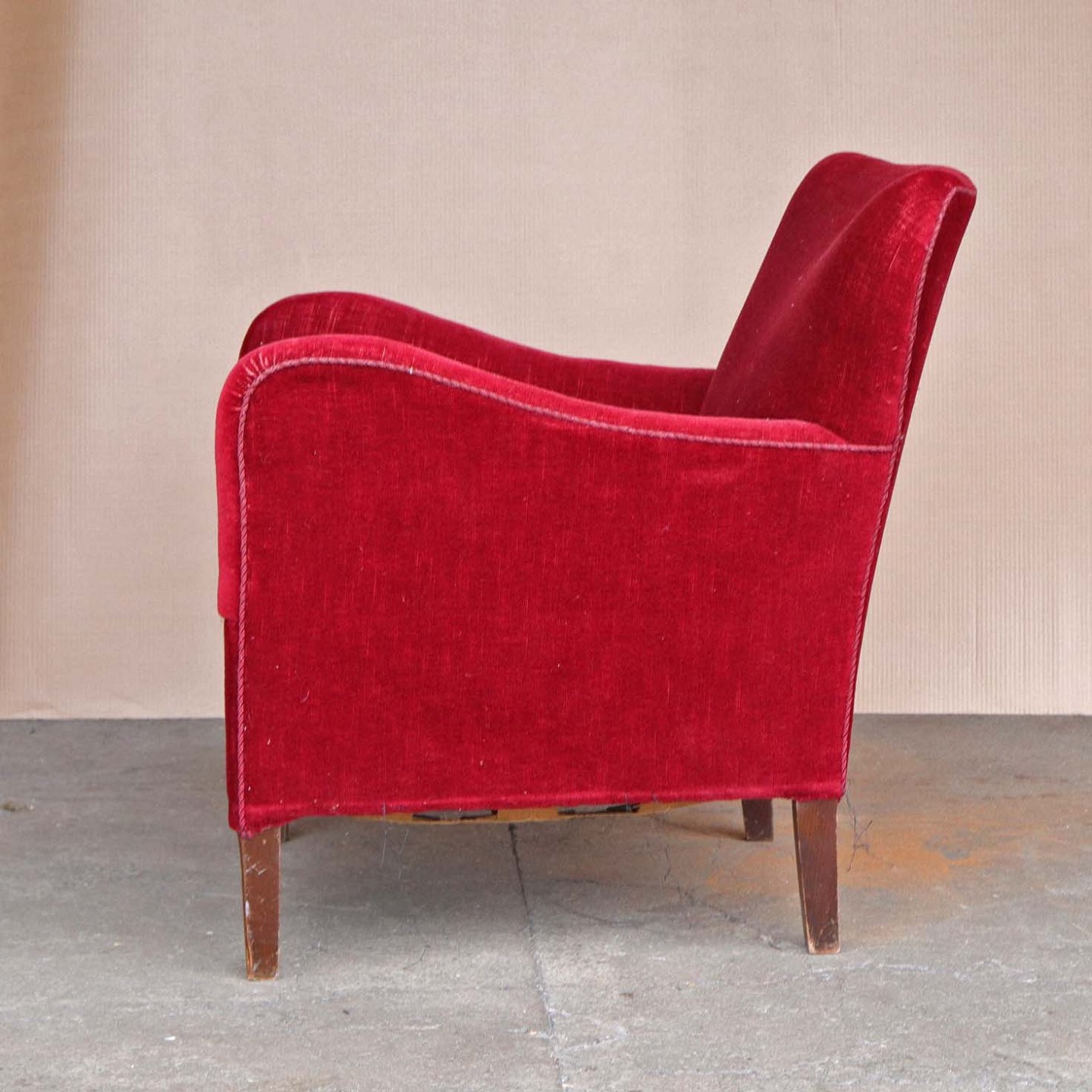 Text available in Danish: Ældre polstret lænestol med springfjeder sæde. Stolen er betrukket med rødt velour stof