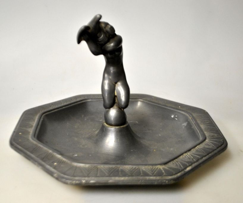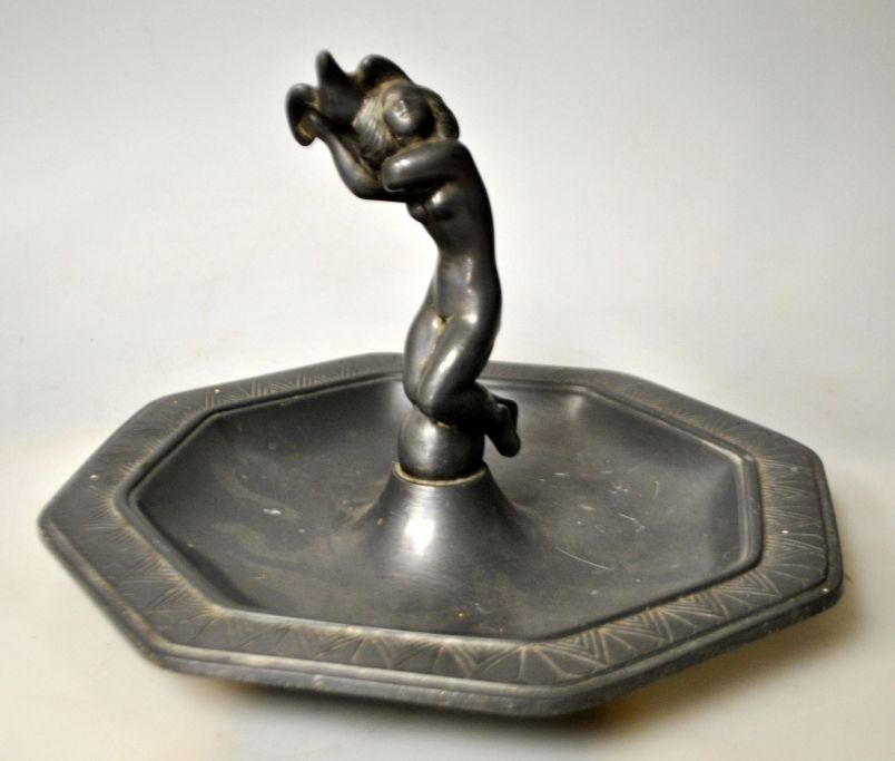 Andersen, Just (1884 - 1943) Danmark: Askeskål med kvindefigur. No. 1995. Mat tin. Stemplet. Dia. 21 cm. 6 - kantet skål. Produceret fra 1938.