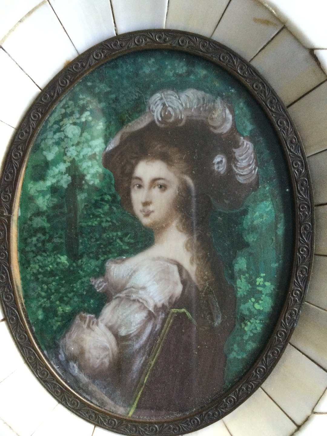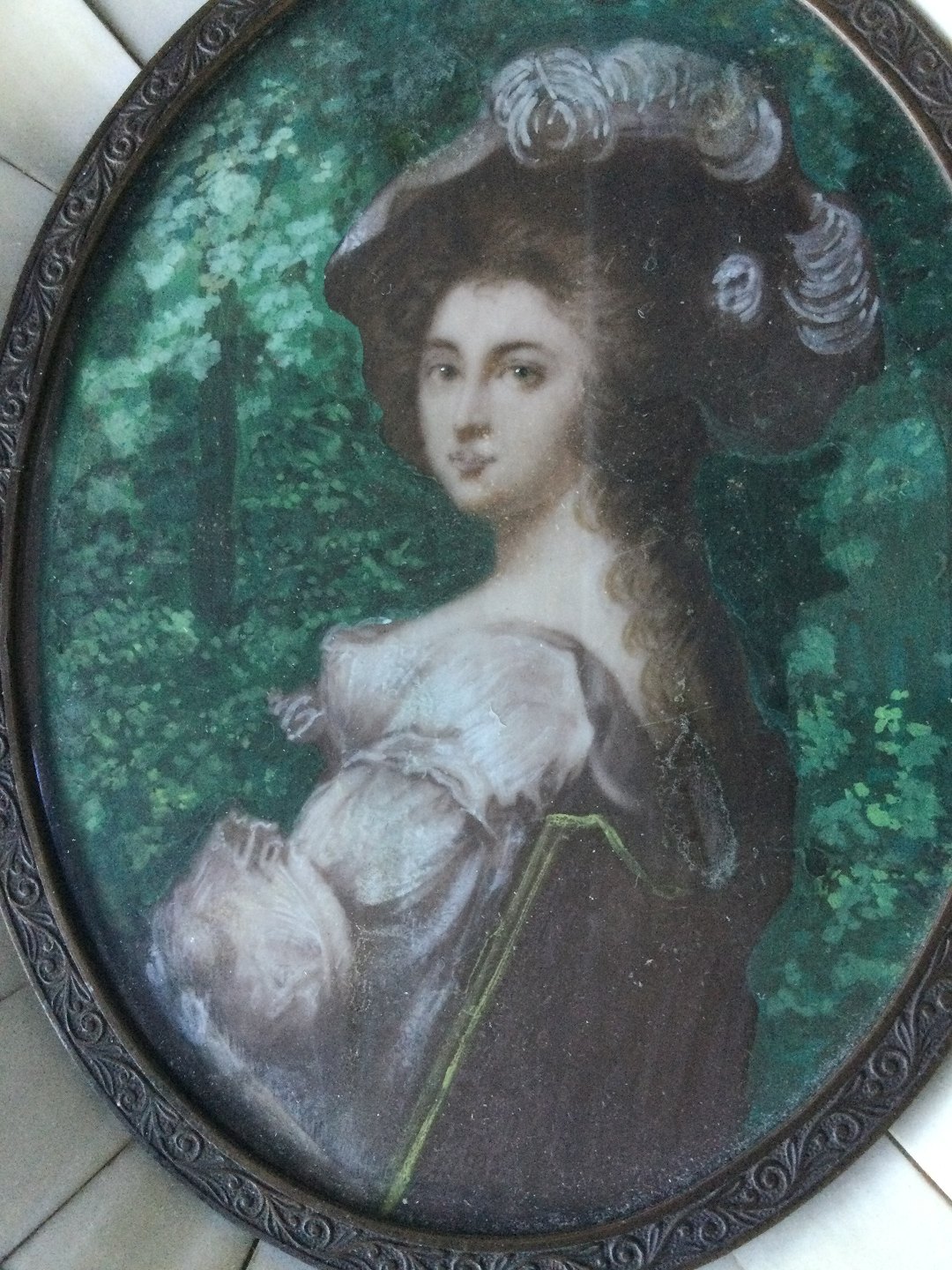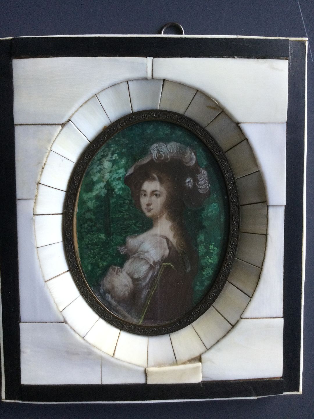 Miniature portræt i benramme - Portræt af ung kvinde med fjerprydet hat i havelandskab.