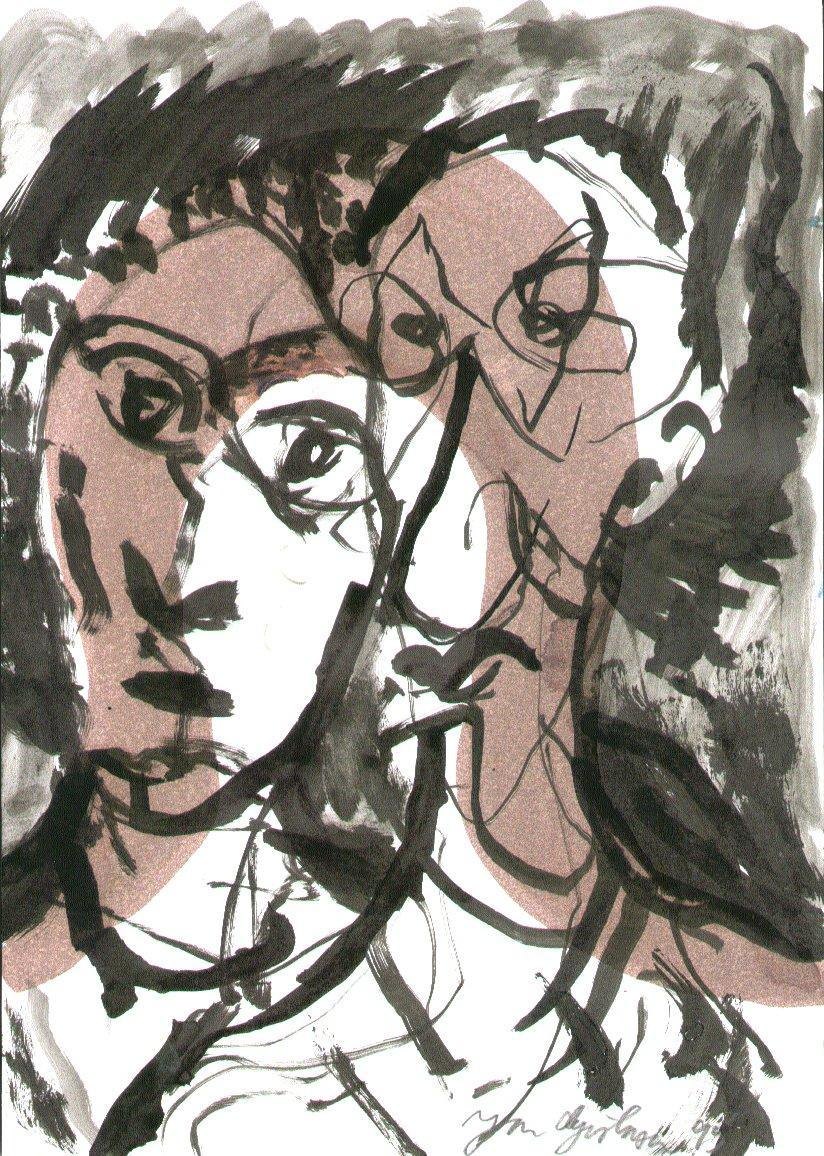 Gislason, Jon (1955-): Dobbeltportræt. Akvarel/tusch på papir. Sign.: Jon Gislason 95. 30 x 21 cm.