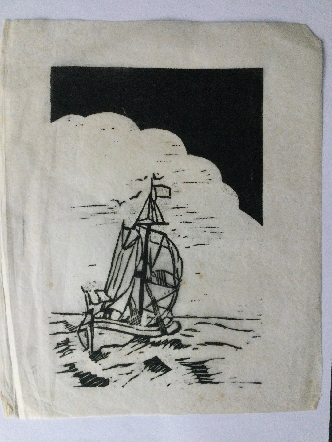 Træsnit af Sven Enselmann - Sejlskib på vandet.