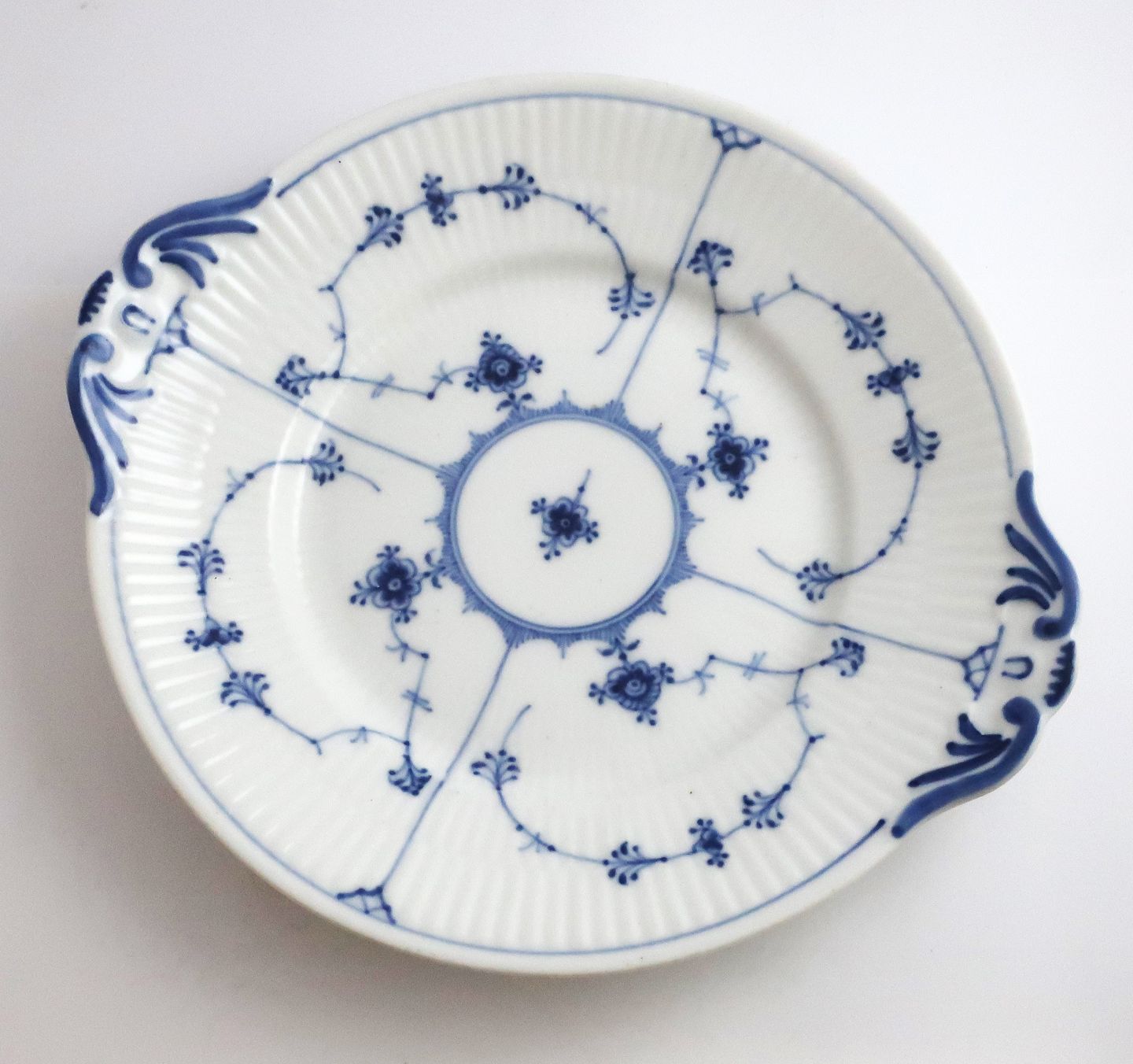 Royal Copenhagen. Musselmalet, riflet. Ovalt kagefad. Model 2152. Diameter 25 cm. (1 sortering)