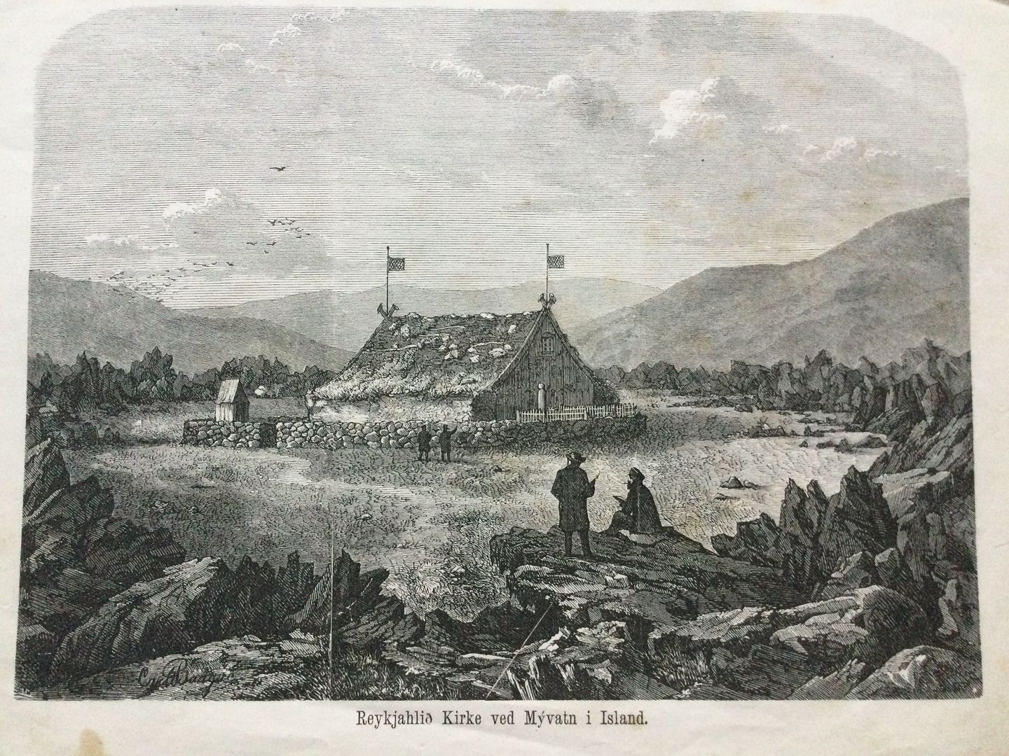 Betegnet "Reykjahlid Kirke ved Mývatn i Island".
