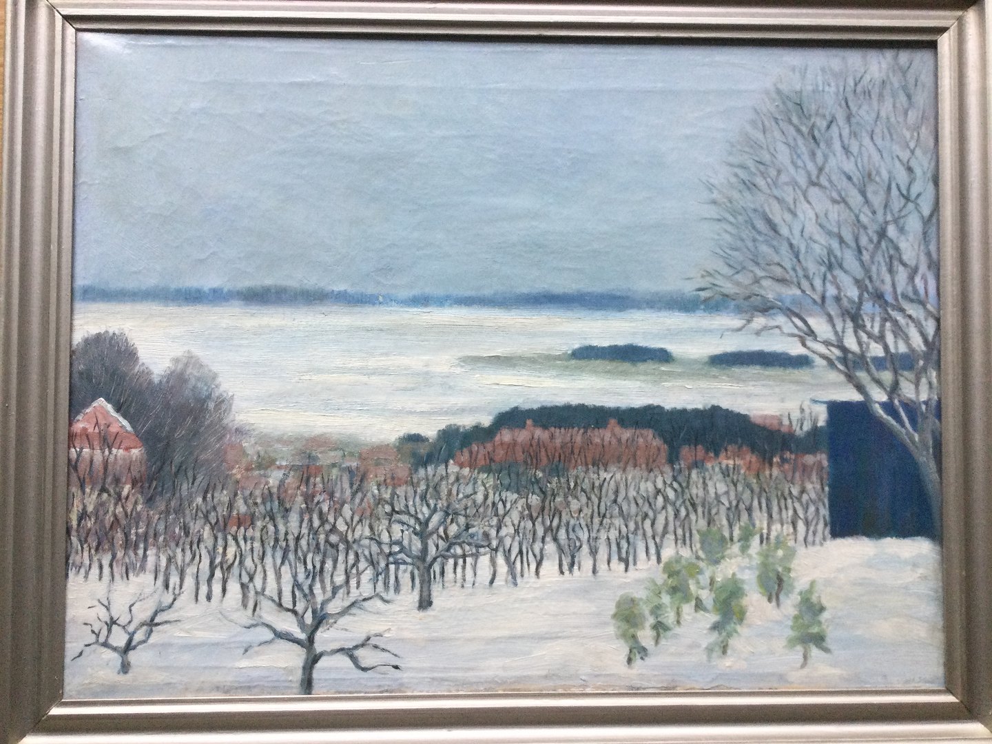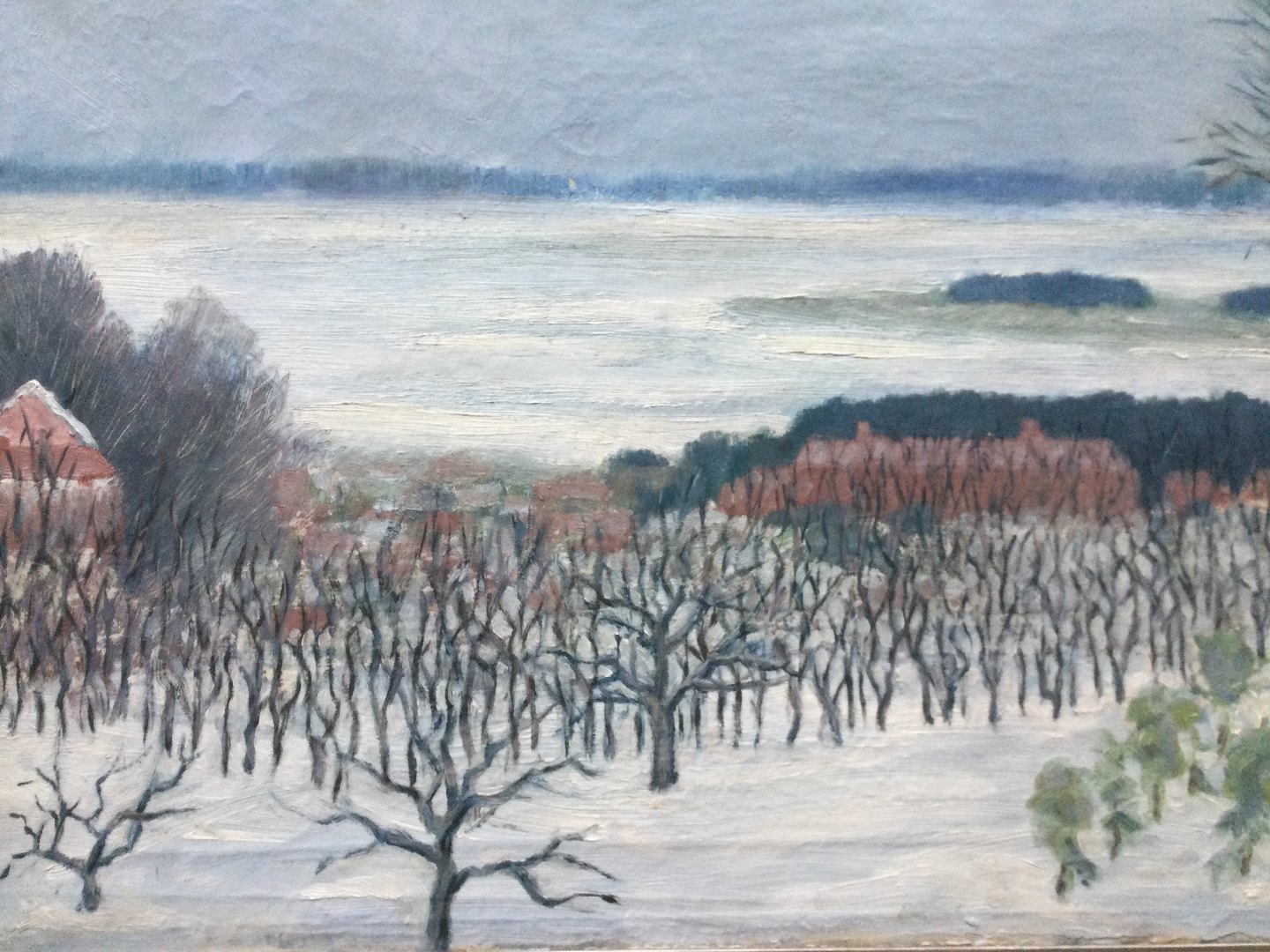 Maleri af Elisabeth Schou - Vinterparti med nøgne træer og by.