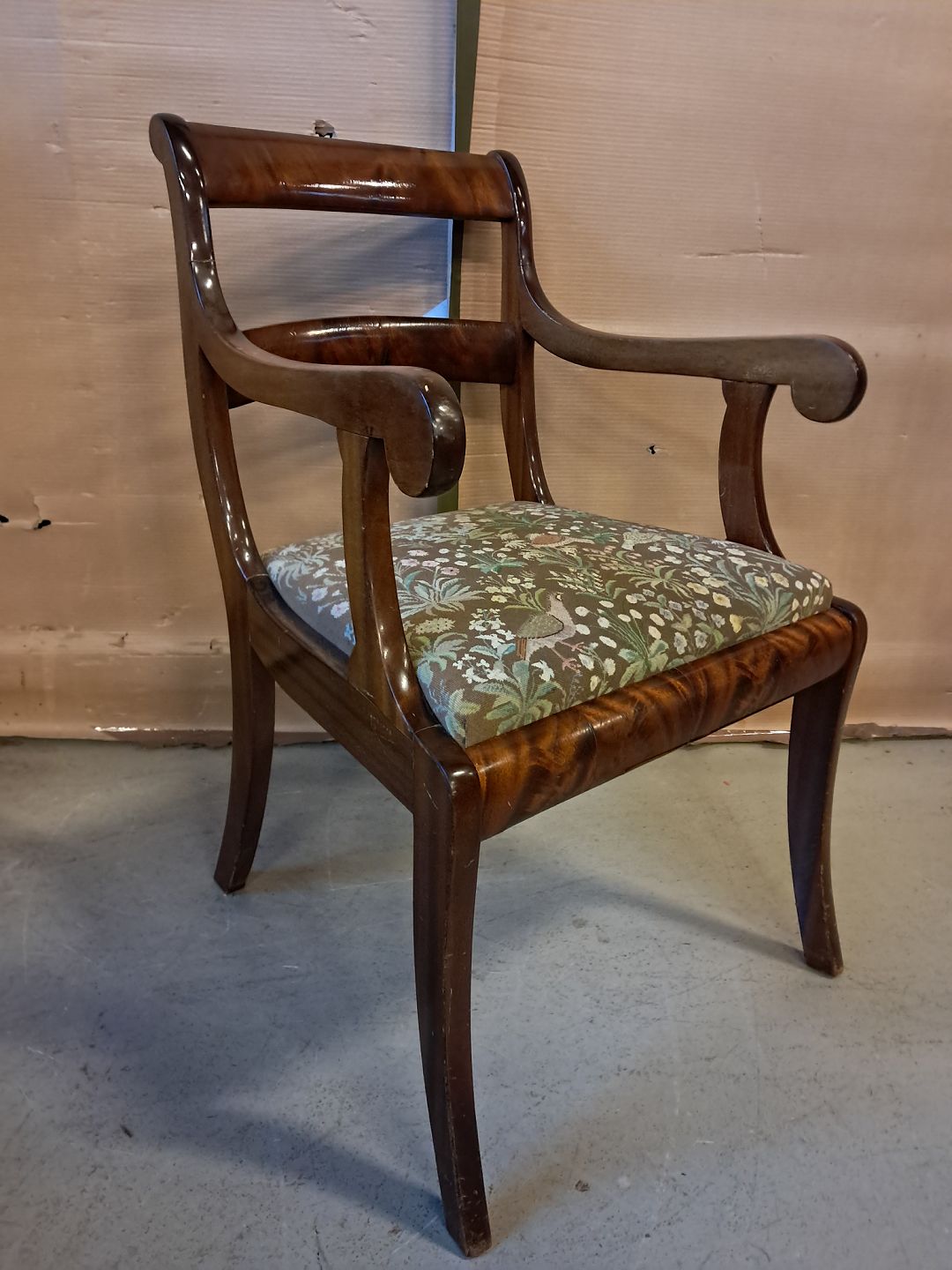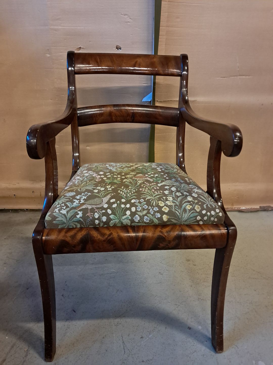 Armstol i mahogni og bøgetræ med broderet betræk, fra 1910erne.