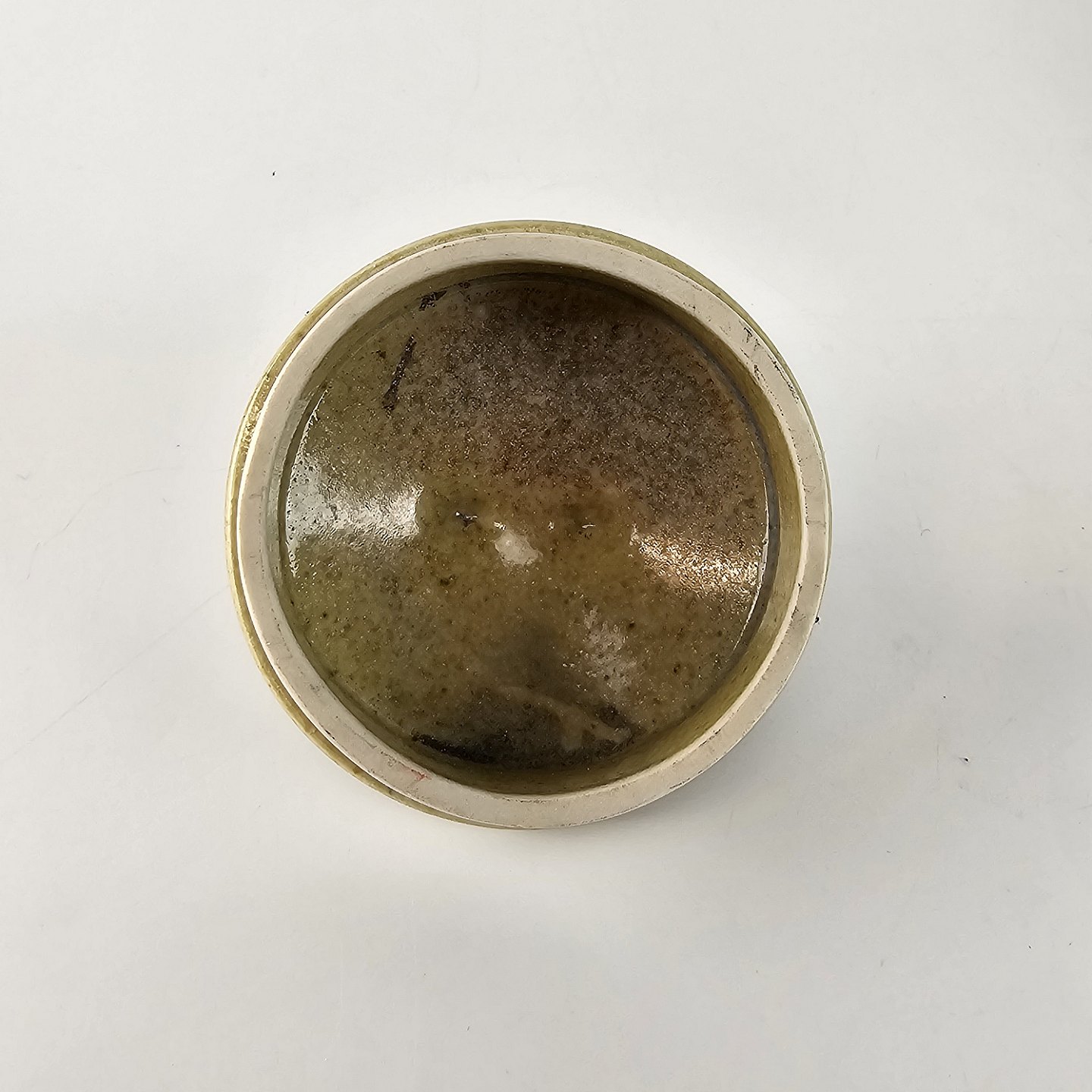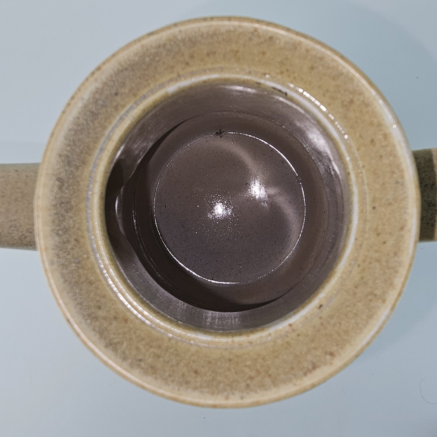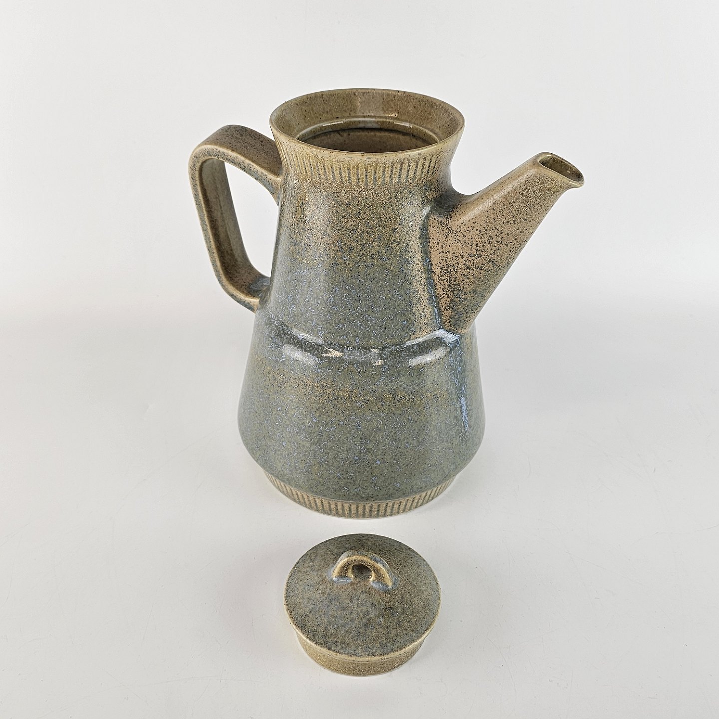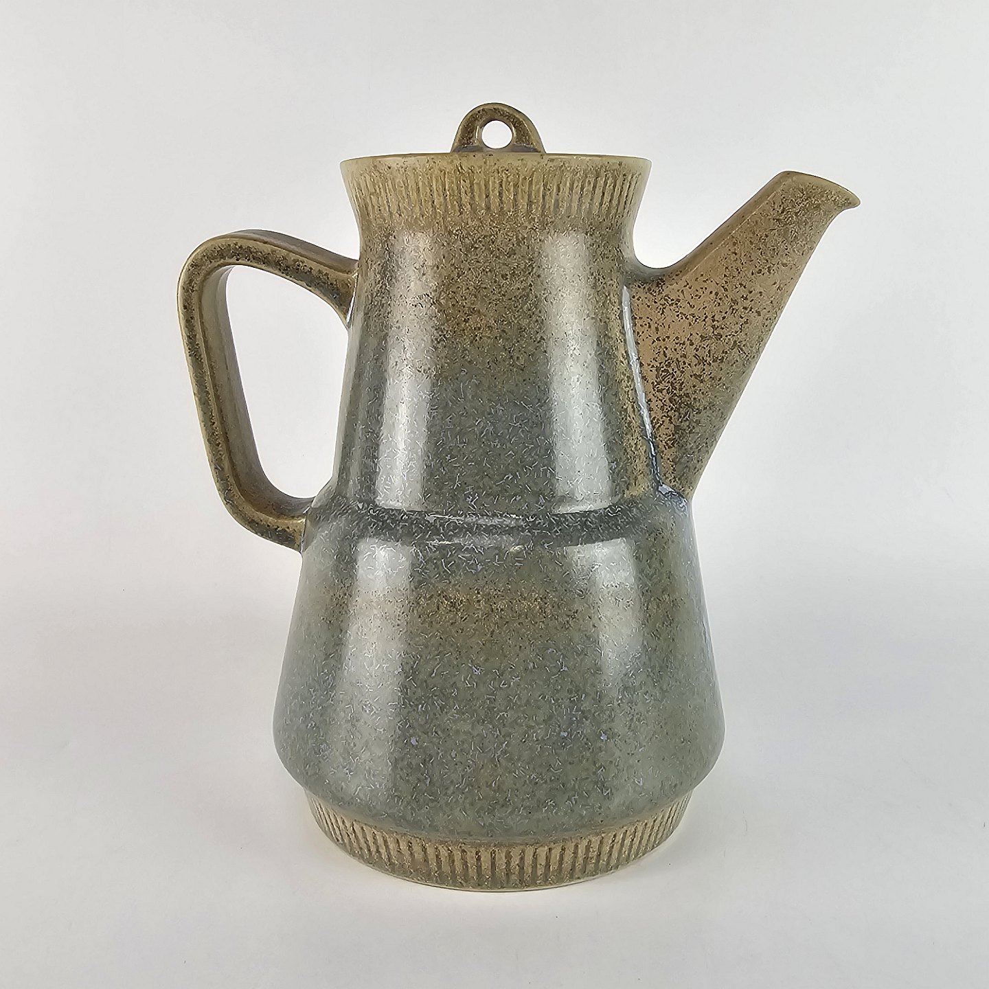 Kande af stentøj og dekoreret med en grønlig nuance glasering.