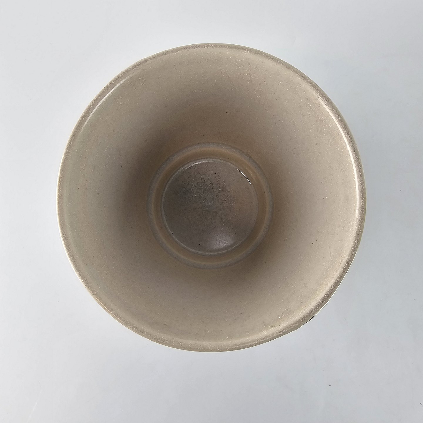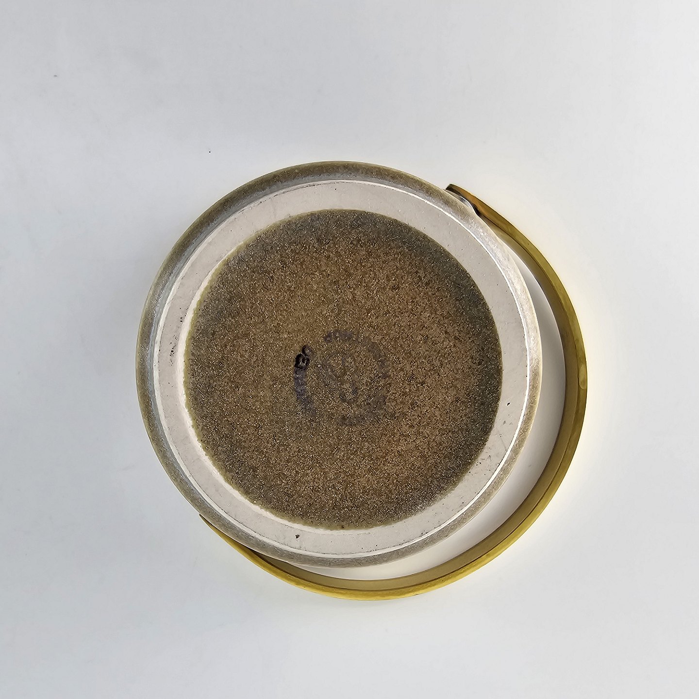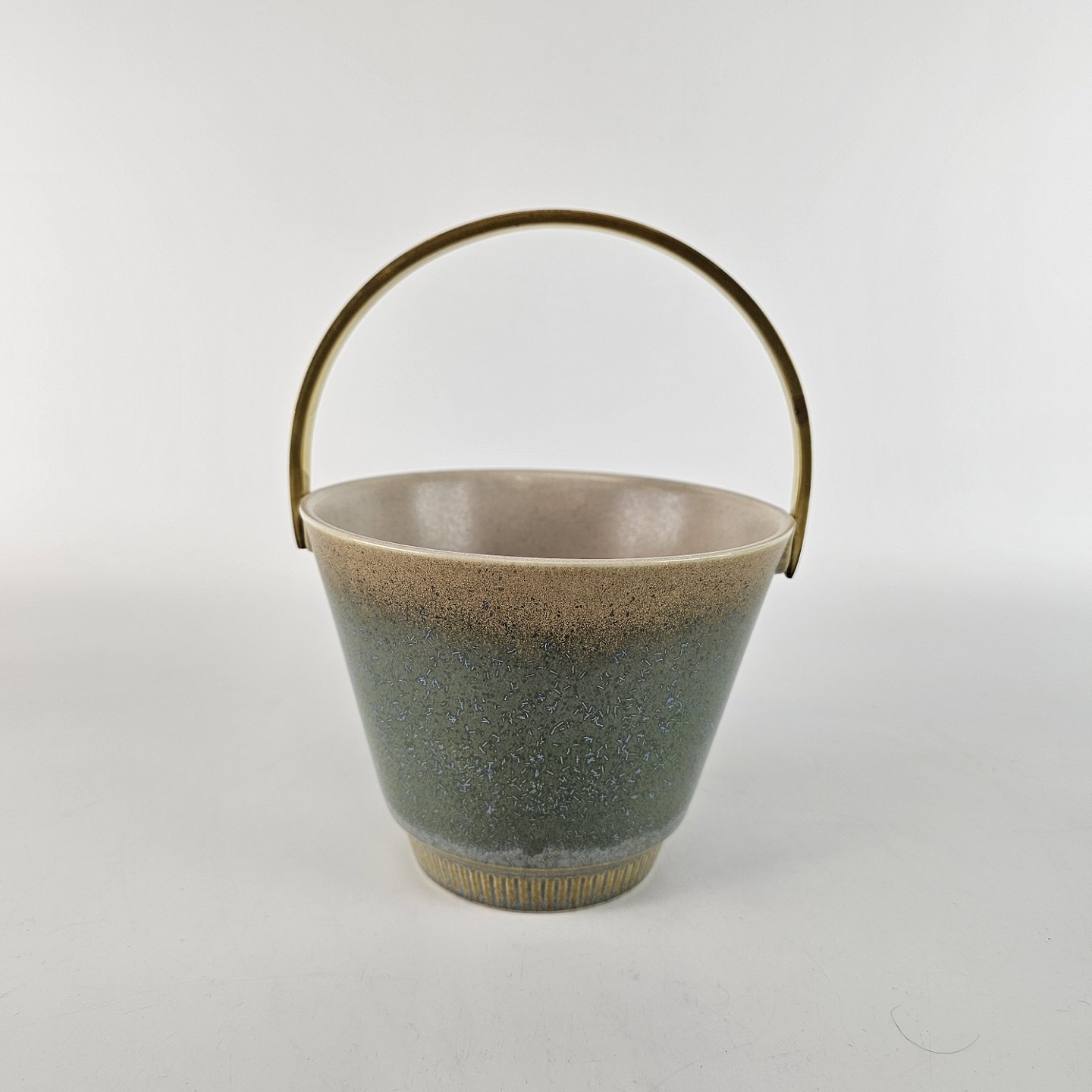 Skål med guldfarvet hank af stentøj og dekoreret med en grønlig nuance glasering.