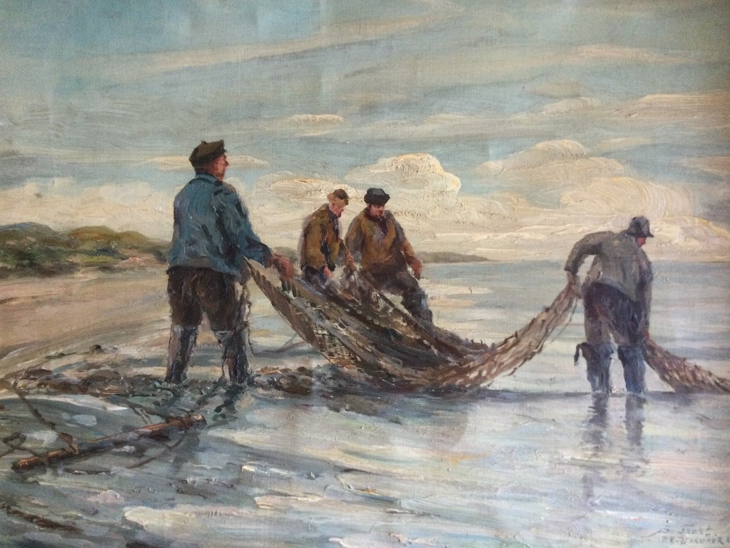 Maleri af Sergius Frost - Der trækkes vod på stranden efter makrel, Nr. Vorupør 4. august 1955.