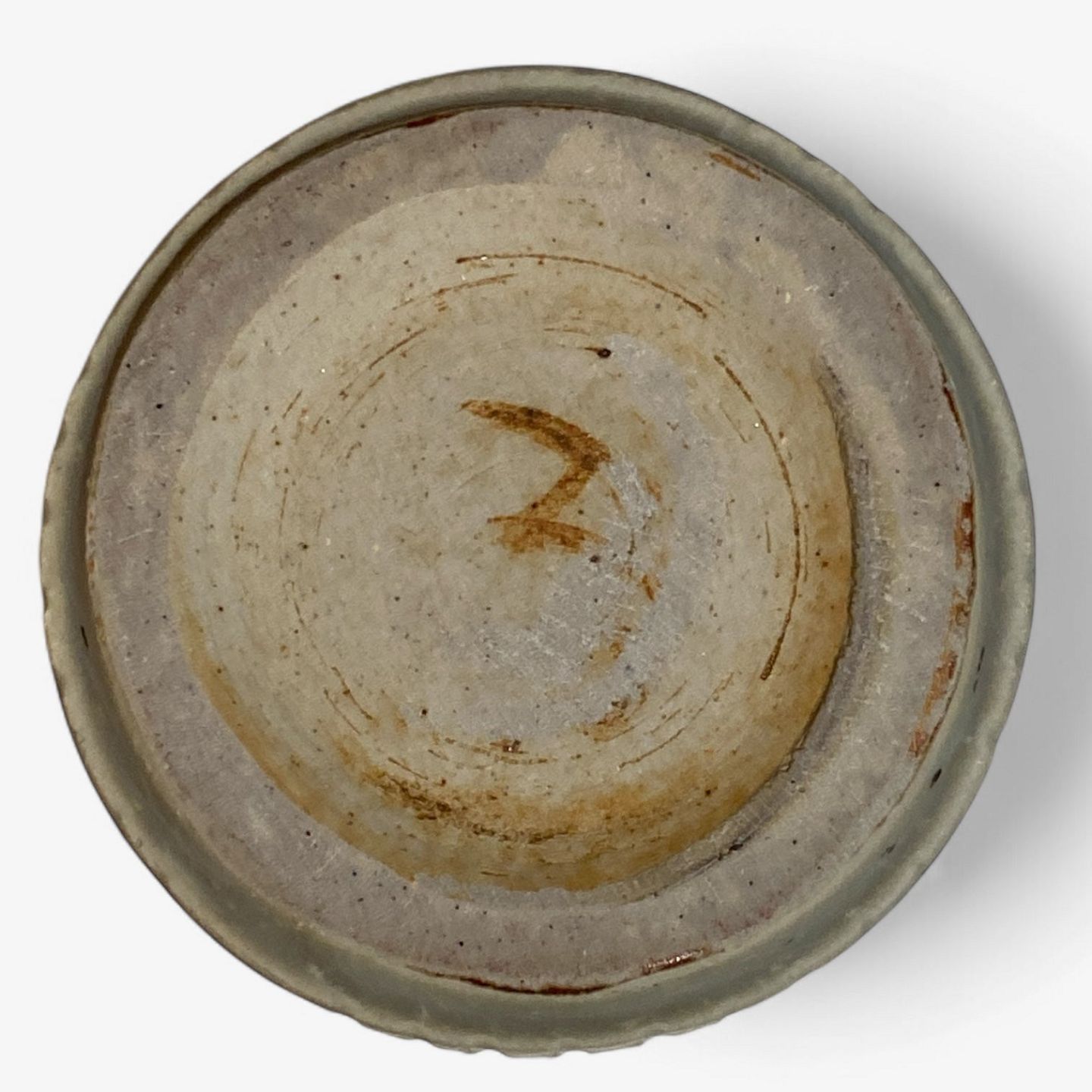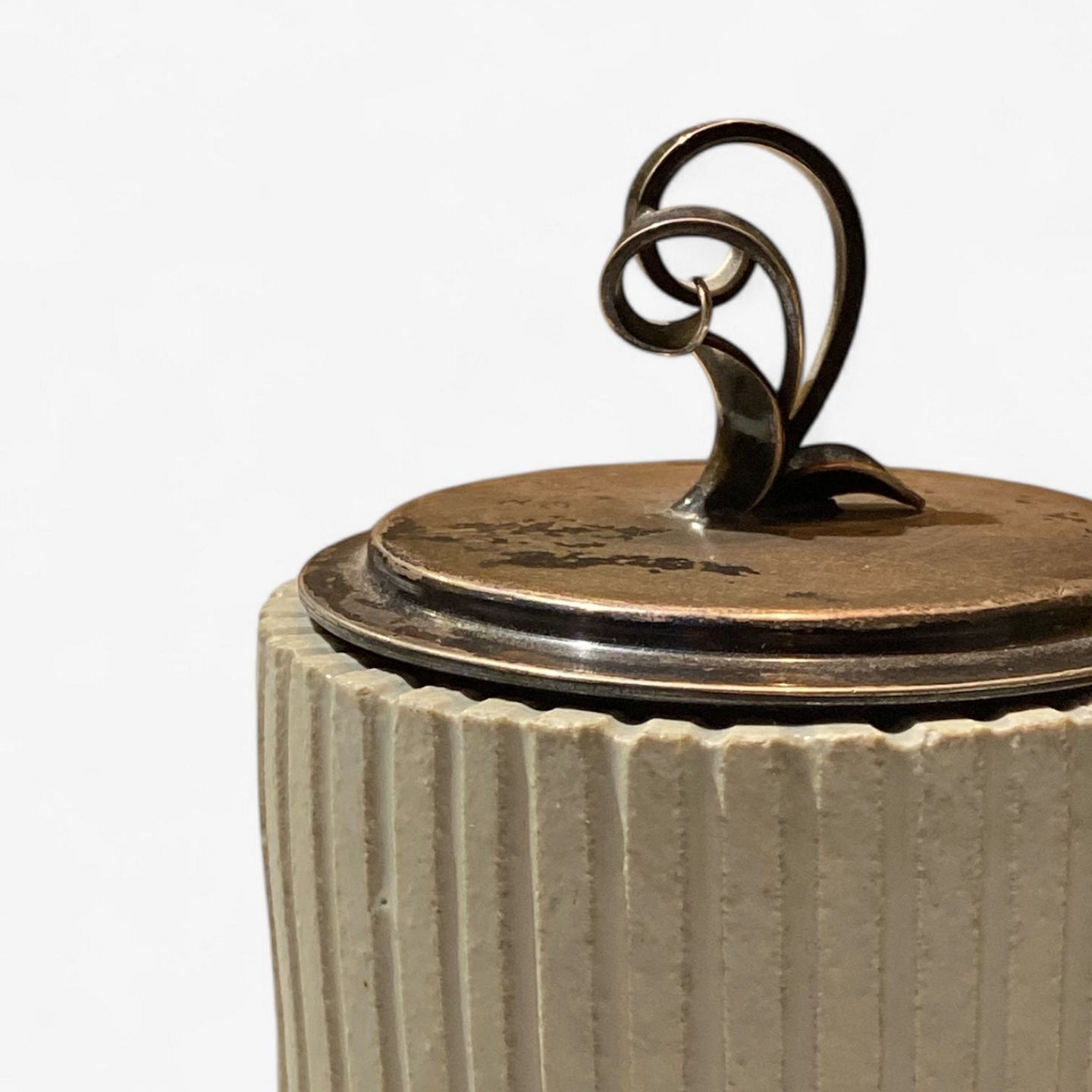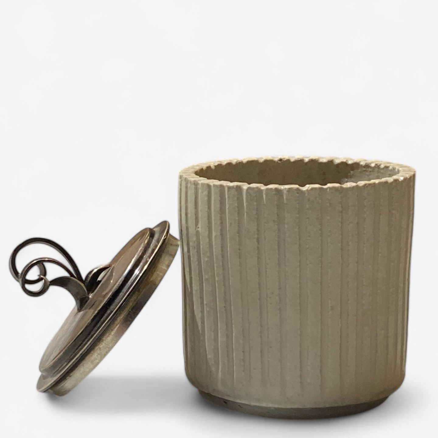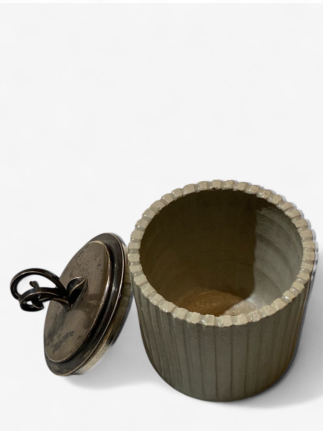 Lågkrukke i riflet stentøj og sølv med lys glasur.