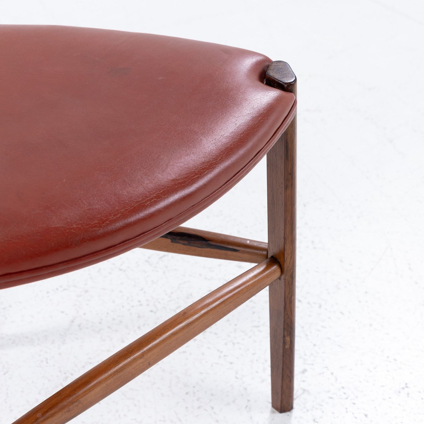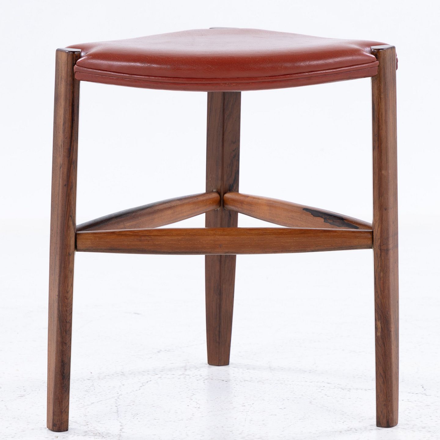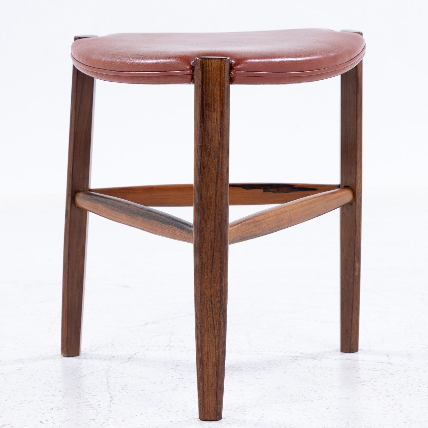 Skammel med tre ben i palisander og rødt læder.