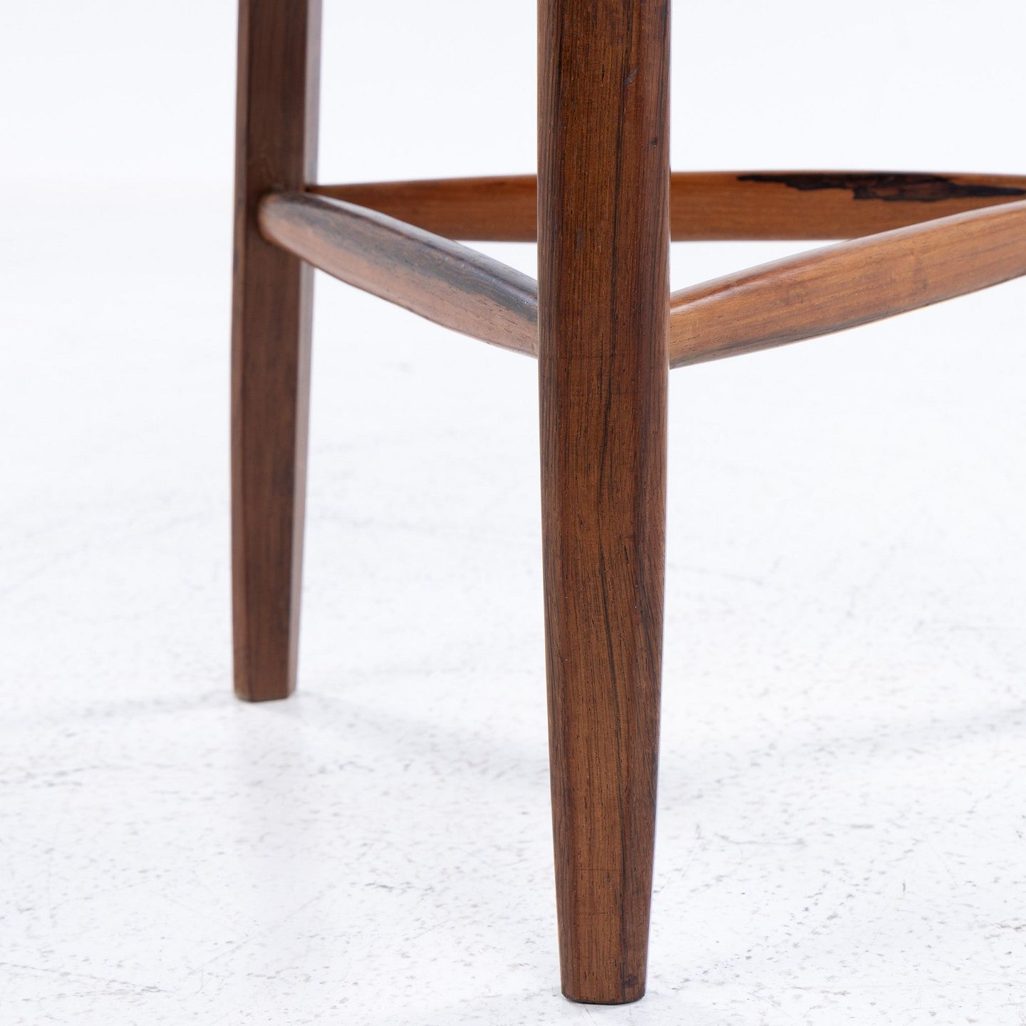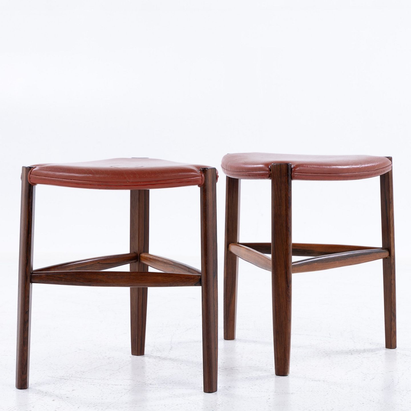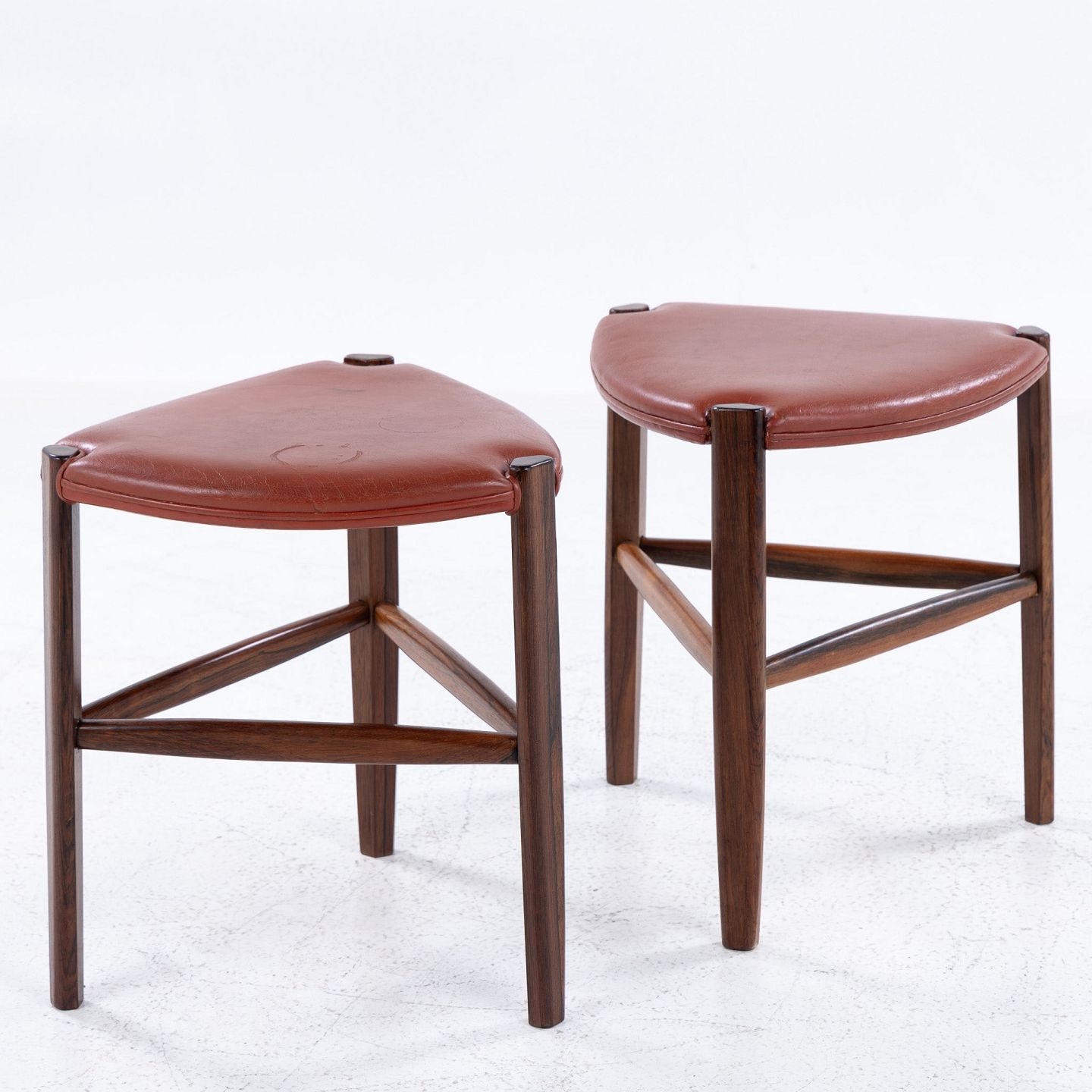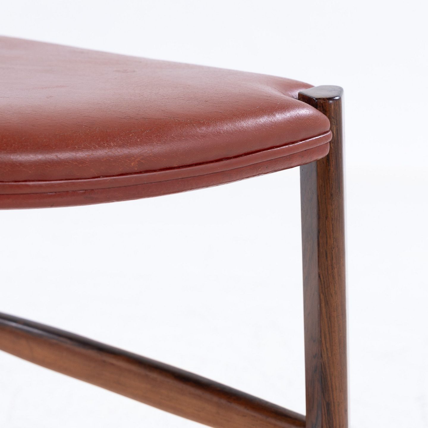 Skammel med tre ben i palisander og rødt læder.