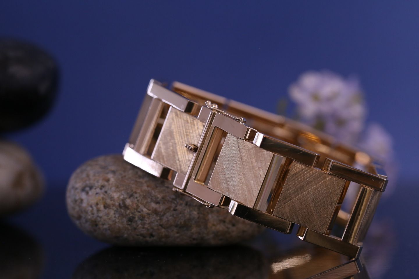 Wide block gold bracelet, 14 carat gold, with 3 rows and engravings. Stamped EHS 585.