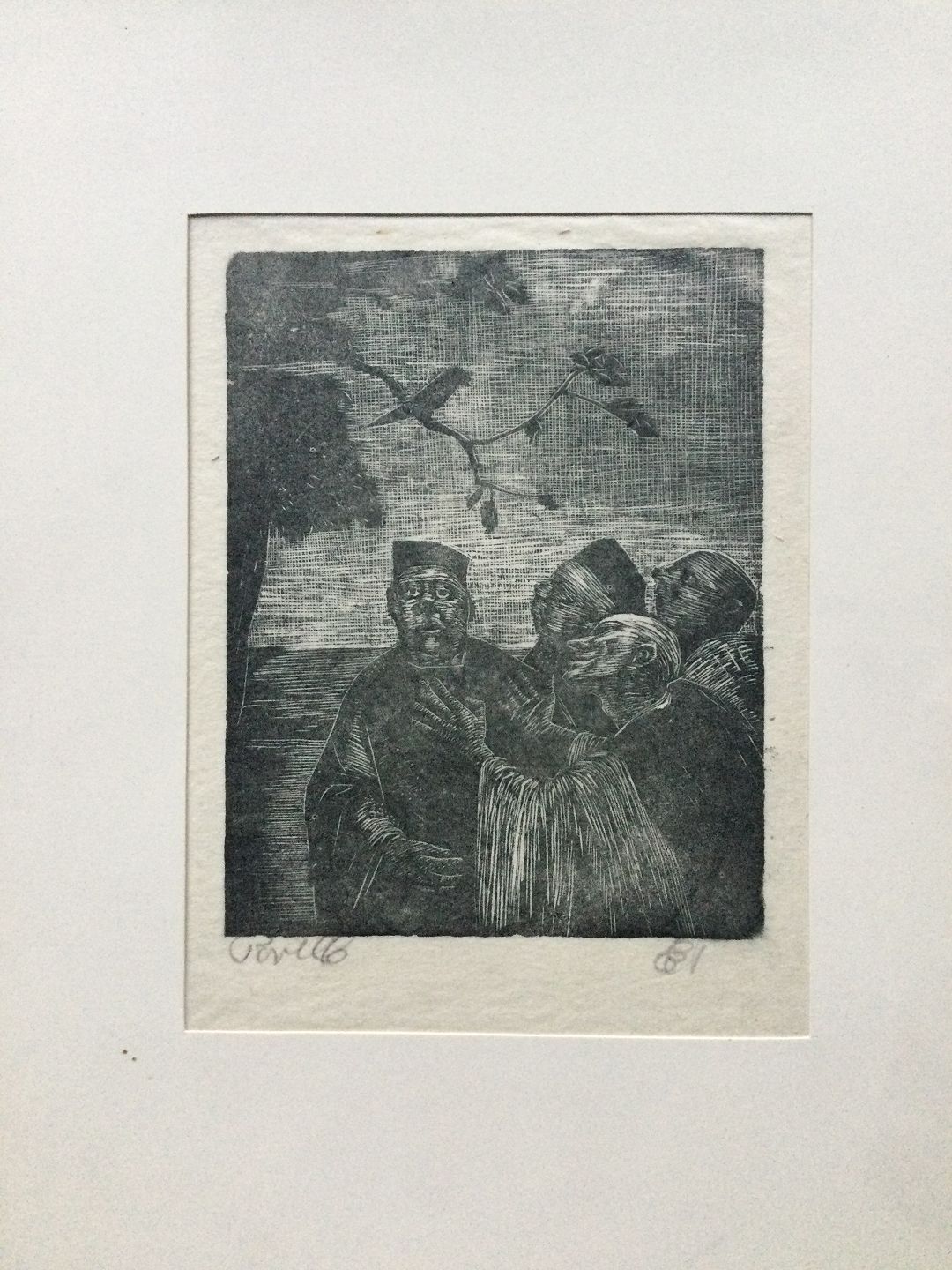 Træsnit på japanpapir monteret i passepartout.