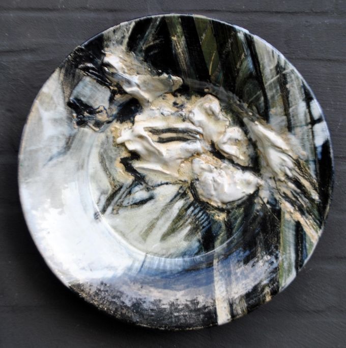 Hagedorn-Olsen, Jeppe (1929 - 2011) Danmark: Kollosal fad. Keramik. Med blå, sorte og hvide glasurer. Signeret. H.: 9 cm. Dia.: 39,5 cm.