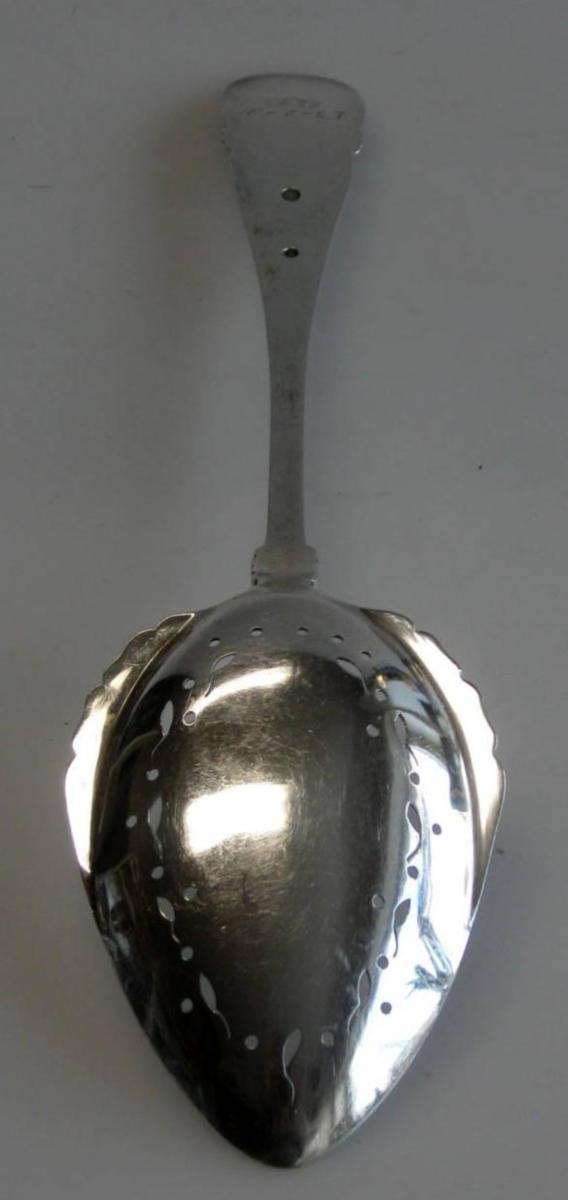 Jordbærske i sølv, 1924, hamret sølv. Gennembrudt hjerteformet laf. L.: 28 cm. Vægt.: 86 gram. Indgravering fra Odd Fellow Logen.