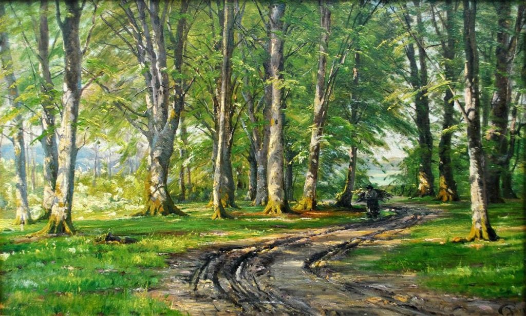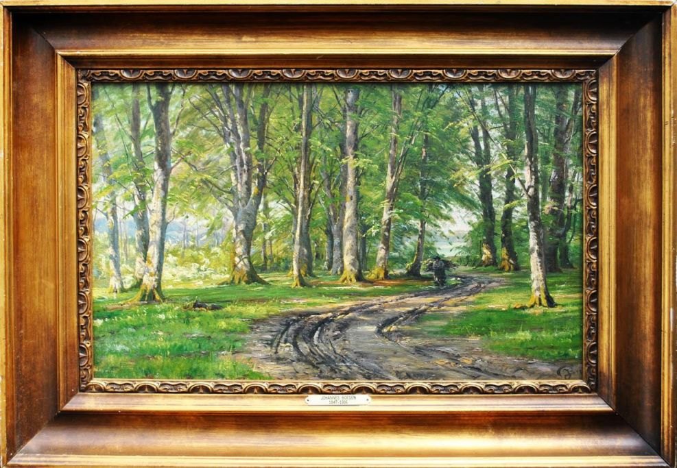 Boesen, Johannes (1847 - 1916) Danmark. En kvinde på en vej, en aften i en skov.